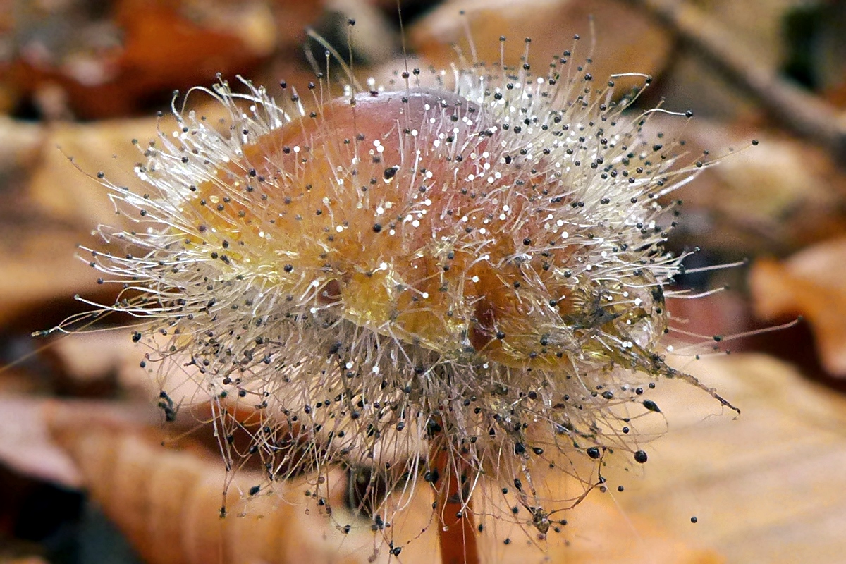 Bild 7 - abeja mit Orangemilchender Helmling (Mycena crocata) mit Helmlingsschimmel (Spinellus fusiger)