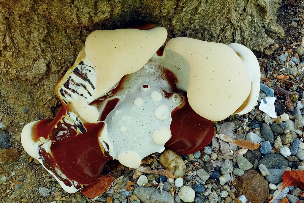 Übrigens noch was Unschönes. Die Pyronema kriege ich nicht bestimmt. Der Kontext für alle anderen: Das war der erste Pilz, der uns gezeigt wurde, weil er auf einer kleinen Brandstelle in Verenas Garten wuchs. Wie nett, die Gattung hatte sich bisher vor mir versteckt. Leider war die Pyronema mittlerweile total aufgeweicht in meinem Döschen und von Konidiensporen durchsetzt. Die freien Sporen, die ich finden konnte, ergeben leider kein einheitliches Bild. Auch wenn es mehrmals betont wurde, weiß ich nicht, ob ich der Sporengröße als Bestimmungsmerkmal glauben kann, nicht nur weil in der Literatur überall unterschiedliche Merkmale stehen. Zumindest denke ich, dass sich vielleicht nicht alle Funde ins Schema einordnen lassen, sondern eher die typischen bzw. besonders groß- oder kleinsporigen Kollektionen. Damit fiele das letzte Merkmal neben Subiculum, Enge des Wuchses und weiteren weg. Auf jeden Fall ist das hier ein Fall, der Ausrutscher in beide Richtungen hat. Für mich in dieser Form leider unbestimmbar, vor allem weil ich nur noch Matsch untersuchen konnte. Vielleicht müssen wir Verena bemühen, einmal nachzusehen, ob es noch weitere Fruchtkörper auf dem Kohlehäufchen gibt.