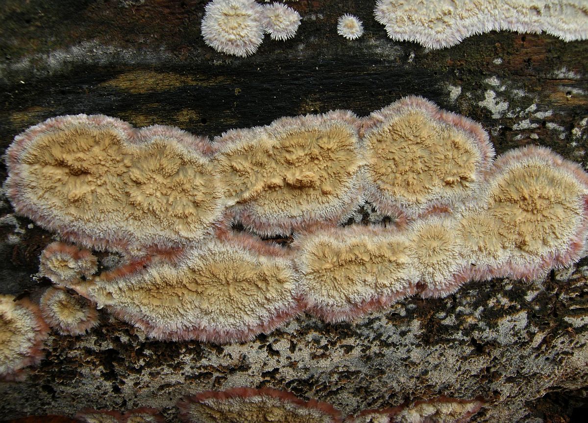 Hypomyces rosellus - Die auffällige Pinkfärbung, die dieser Phellinus spec. beim Stöckchendrehen aufwies, zeigte punktuell auch Fruchtkörper des Porlingsbesiedlers.