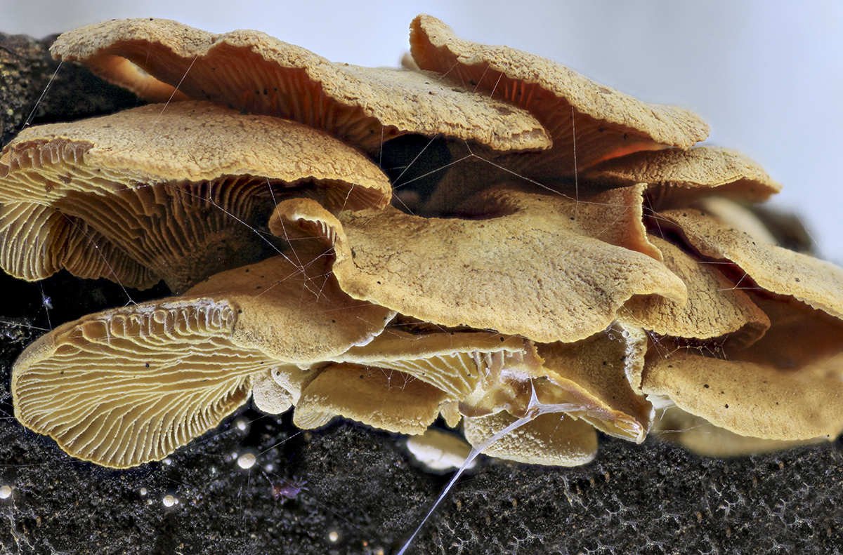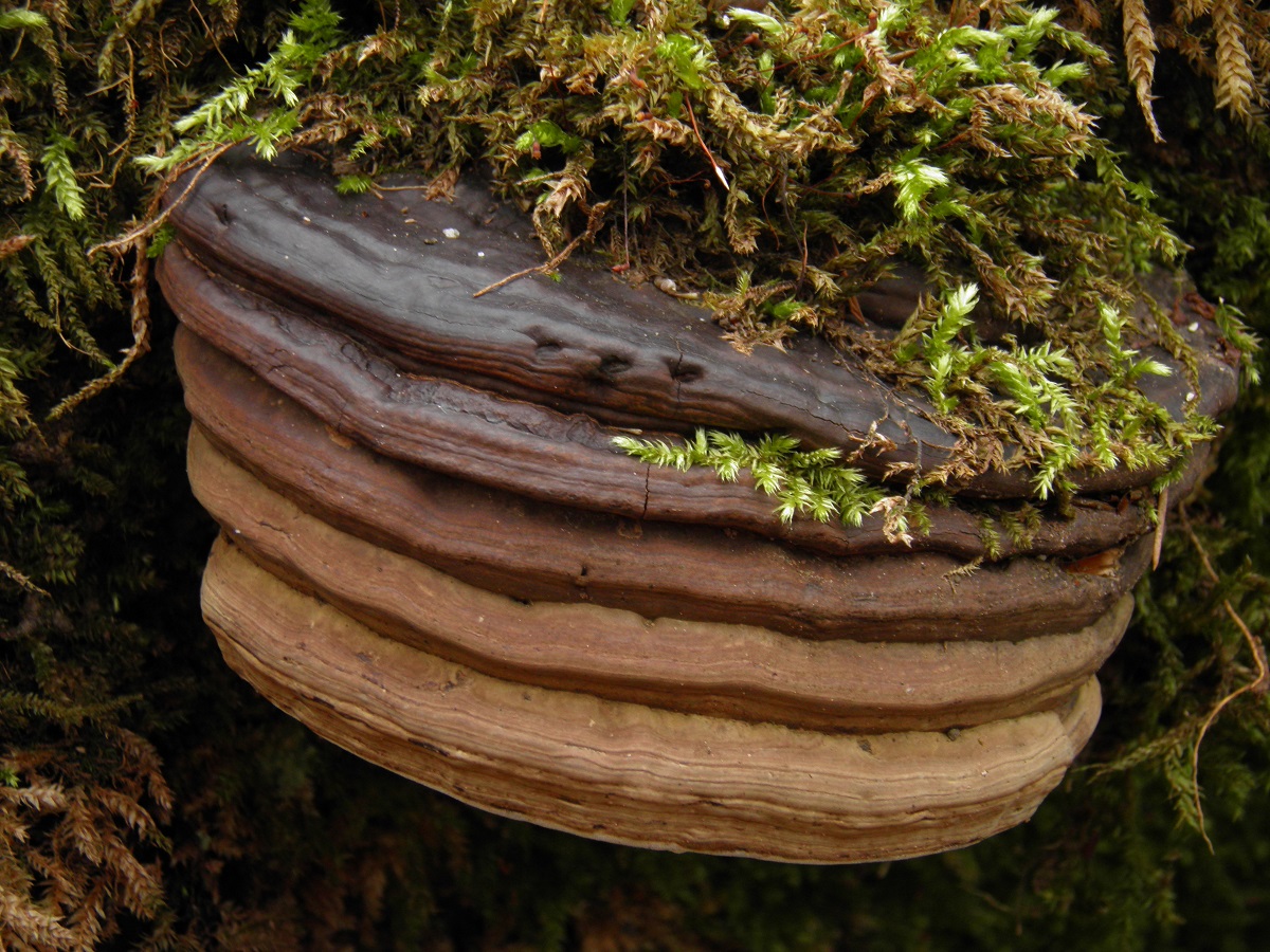 1) Trameten haben immer Poren. Dieser hier hat keine. Es handelt sich um einen Schichtpilz (Stereum spec.)