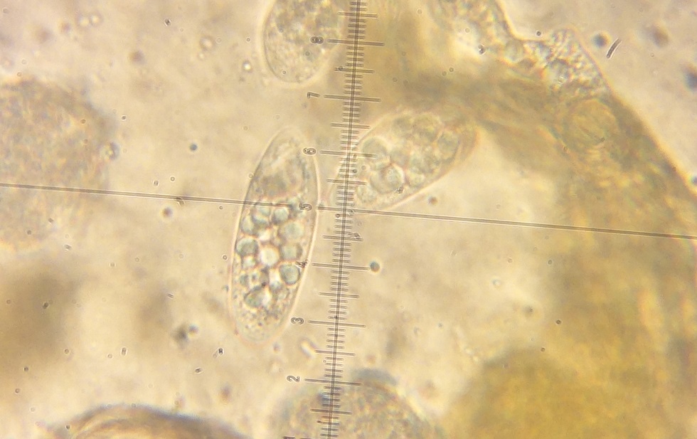 Die Sporen sind etwa 35 x 15 µm groß. Sie müssten aber sowohl kürzer als auch breiter sein (Wikipedia spricht von 27-31 x 20-24 bei dem primären Konidien, jeweils weniger bei den sekundären).