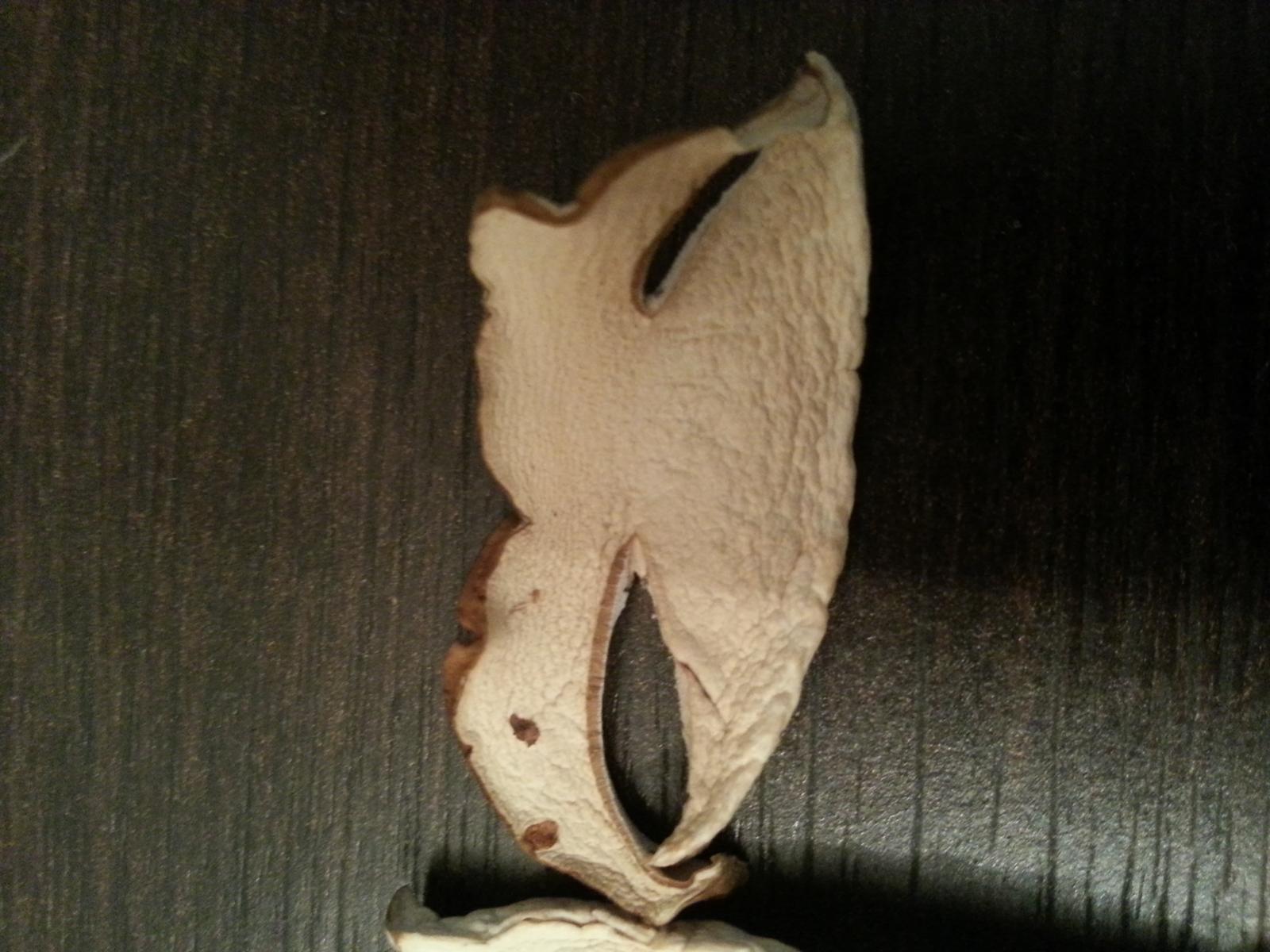 ich hab jetzt versucht ein paar Nahaufnahmen von dem getrockneten Pilz zu machen. Leider hab ich meine Spiegelreflexkamera nicht bei der Freundin und mit der Handykamera funktioniert der Autofokus nicht so gut wenn man nah rangeht. Hoffe dass trotzdem was erkennbar ist. Die "Schicht" mit den Röhren ist recht schmal, was wohl daran liegt dass der Pilz noch recht jung war.