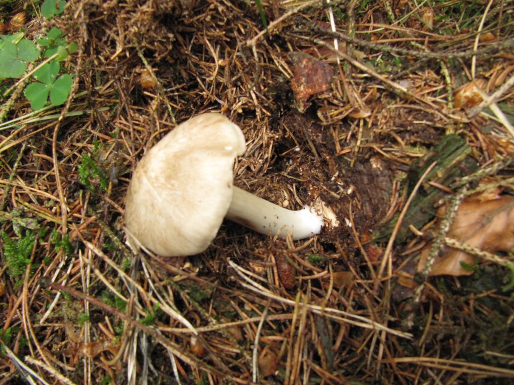 Hut 7cm, weiß, leichte, braune Flocken erst in gewissem Abstand zur Mitte, leicht gebuckelt, nicht schleimig, eher filzartig