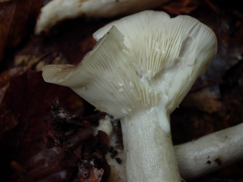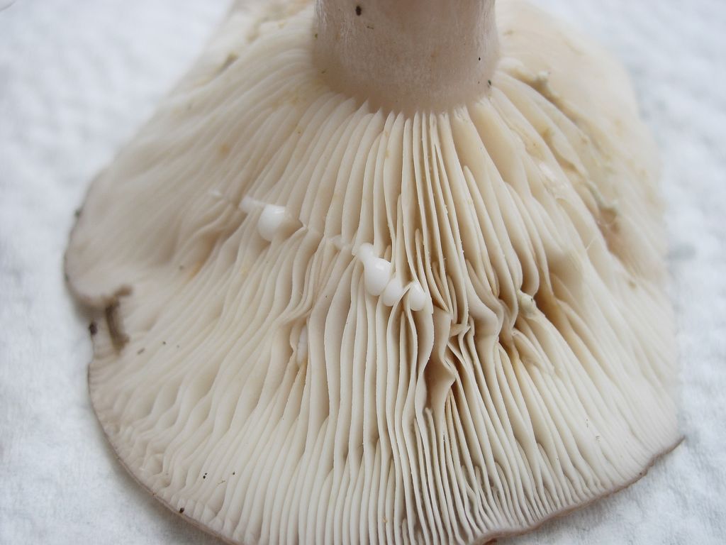 Lamellen: Angewachsen oder laufen leicht am Stiel herab, sie stehen ziemlich gedrängt und sind anfangs weißlich, och bald blass creme- bis ockergelb gefärbt. An verletzten Stellen können die Lamellen von eintrocknenden Milchtröpfchen blass blau-grünlich gefleckt sein.