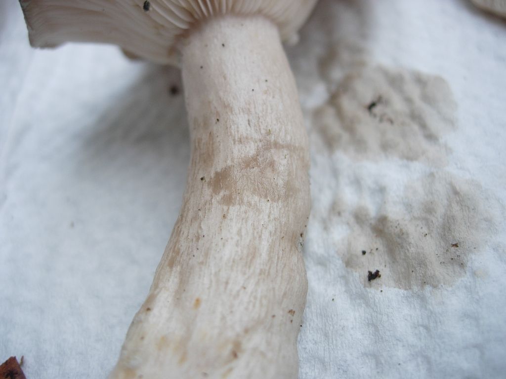 Stiel: 3-7 cm lang, grau weisslich bis rosagrau, zur Basis hin meist unterschiedlich stark verjüngt, bei feuchter Witterung etwas klebrig. Im Alter wird der Stiel häufig hohl.