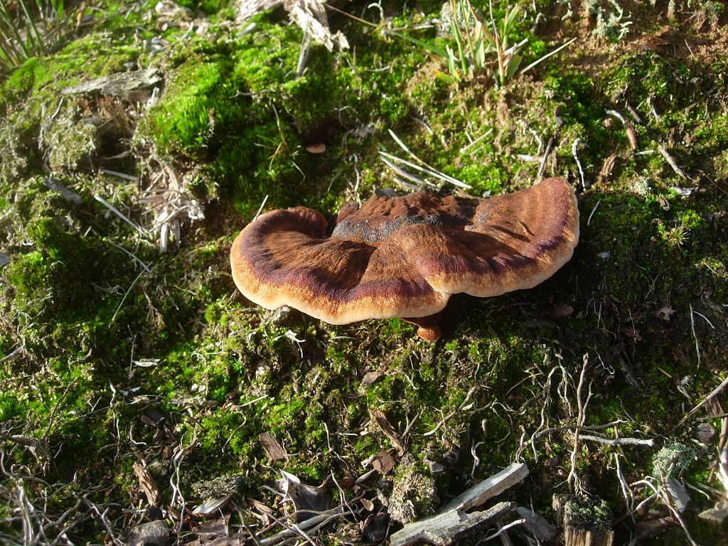 An alten Nadelholz Stubben fand ich Pilze die ich als junge Schwarzgebänderter Harzporling bestimmen würde. Viell. sag mal jemand was dazu. (Pablo?)
