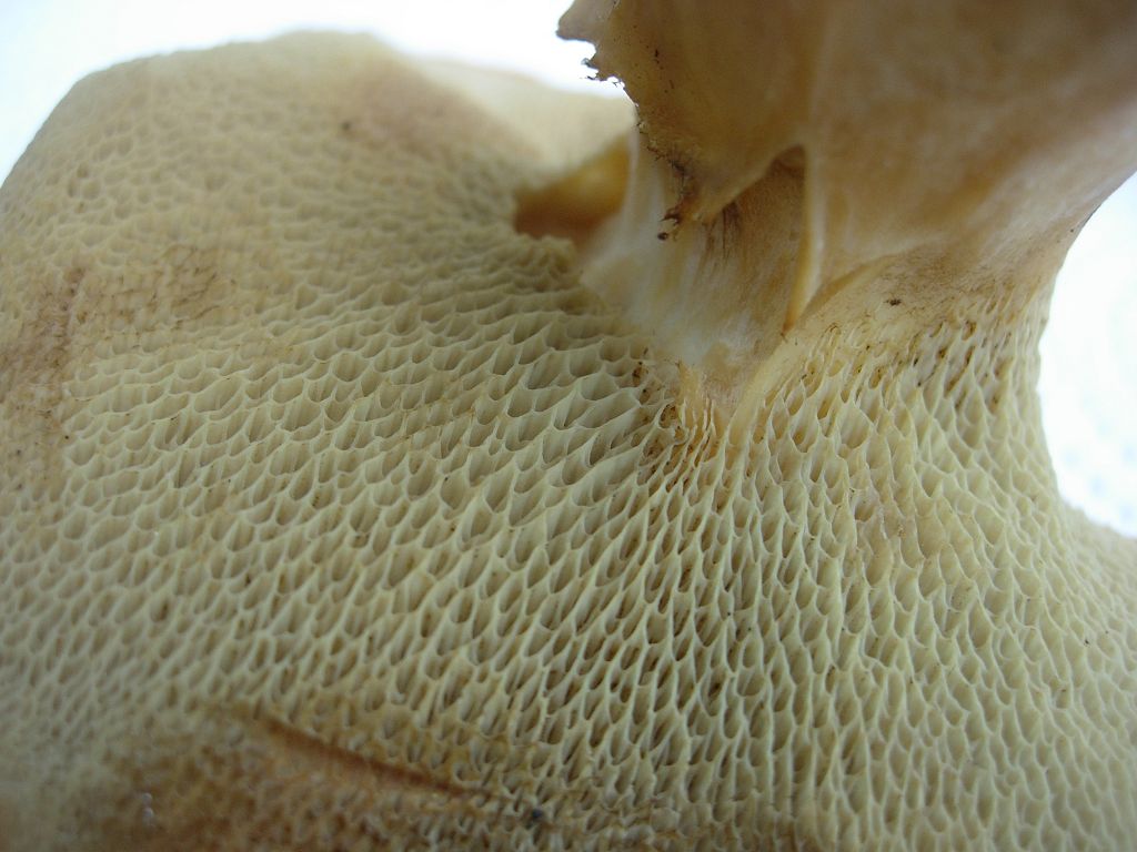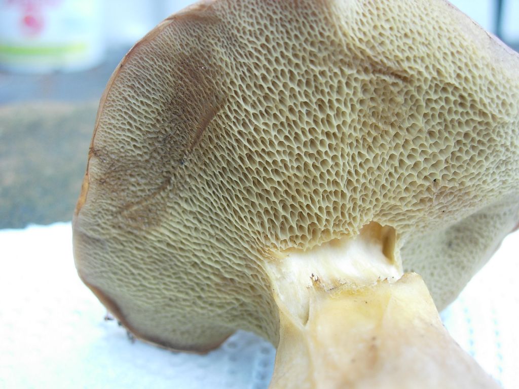 Poren: Sehr kurz und schwer vom Fleisch trennbar, im alter breit, eckig bis lang gezogen, sie sind eng am Stiel angewachsen und manchmal laufen sie an den herunter, die Farbe ist graugelblich bis olivgelb oder olivbräunlich.