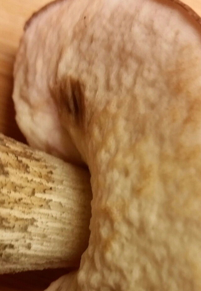 Auch andere stellen z.b. wenn man ein Stück haut abzieht oder am Stiel drückt oder schneidet wird es sofort safranfarbend, später etwas bräunlich.Vielen Dank nochmal