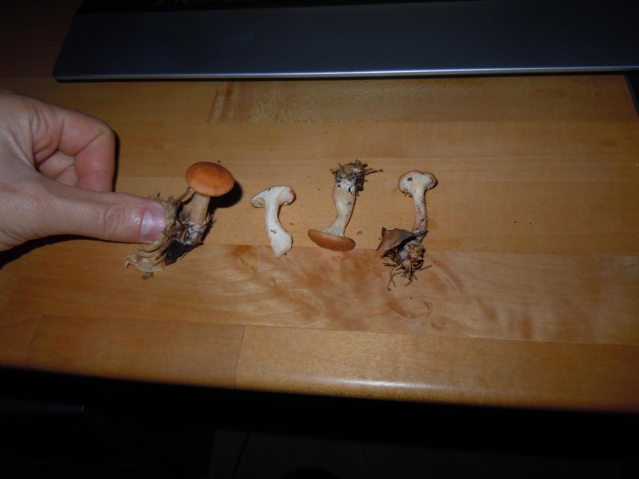 Bei Pilz Nr. 3. Handelt es sich glaub ich um einen Rettichhelmling? Sehr kleiner Pilz ( Hutdurchmesser 1cm, Höhe 3-5cm) der aber häufig vorkommt. Ist an der Basis filzig, der Stiel ist sehr dünn und hohl, die Farbe komplett Violett wobei die Lamellen noch Violetter sind als das Fleisch. Riecht auch nach Rettich... Ich meine dass wir den früher auch mal gegessen haben, in meinem jetzigen Buch steht jedoch dass Muskarin darin nachgewiesen wurde und man deshalb besser auf den Verzehr verzichten sollte...Danke schonmal für die Hilfe