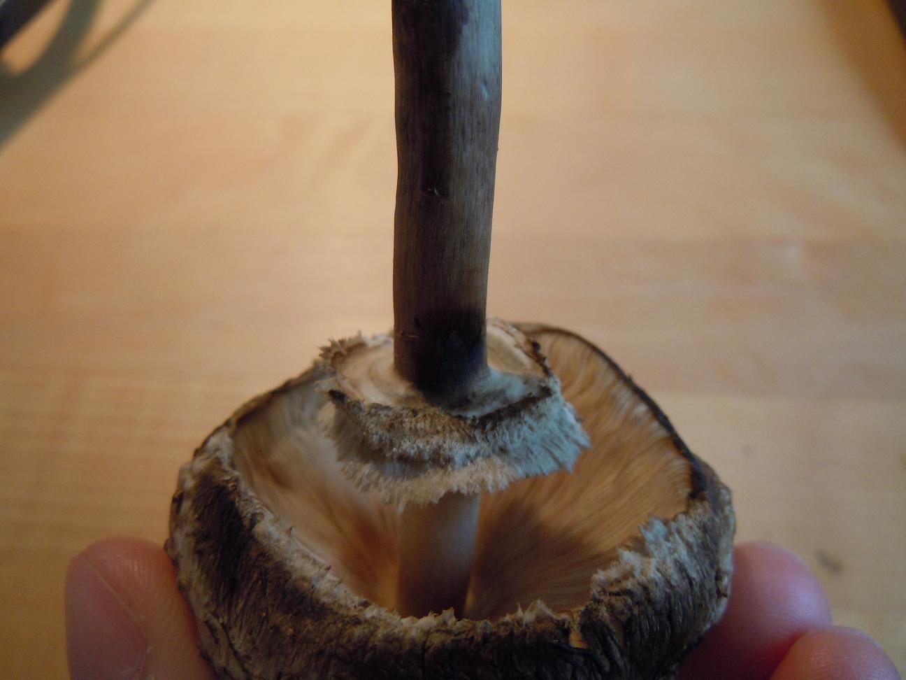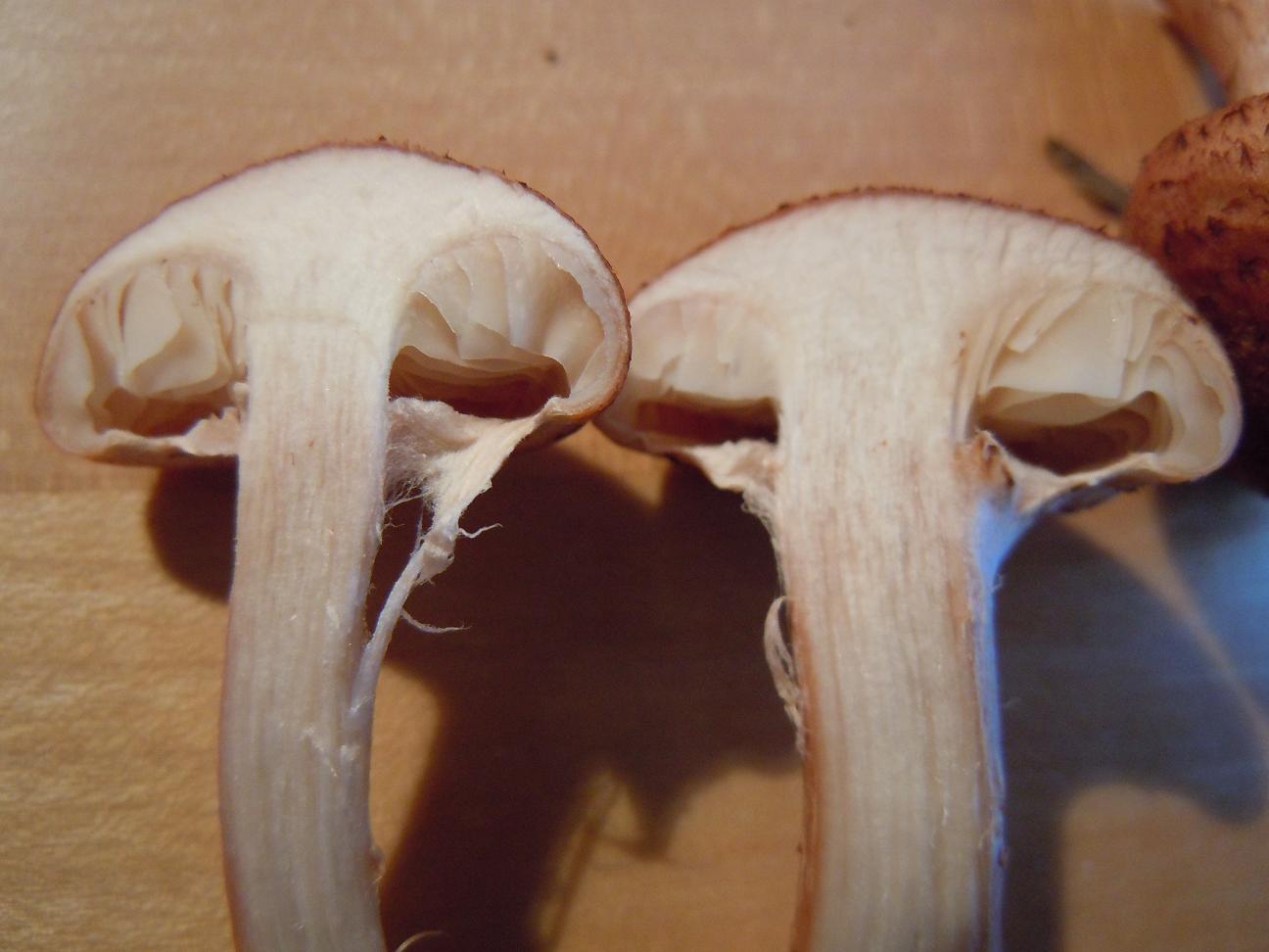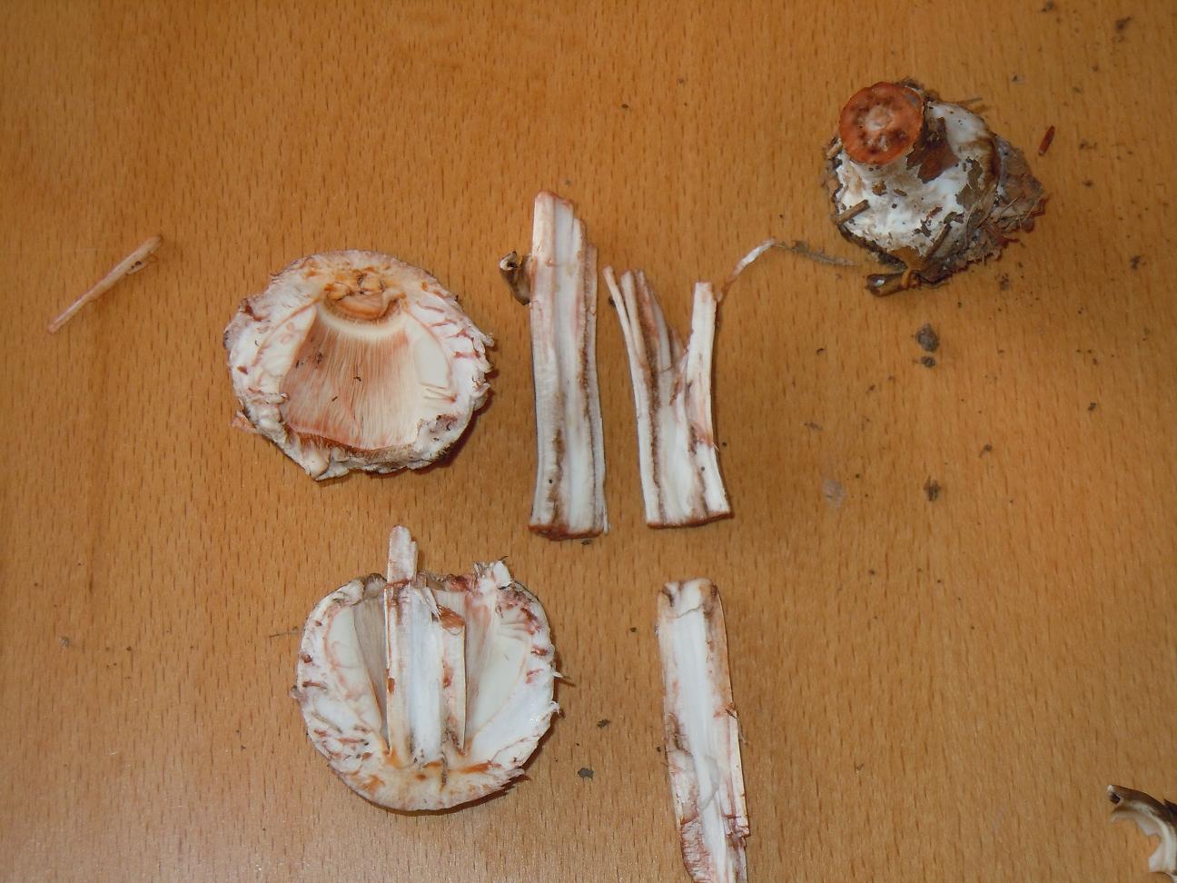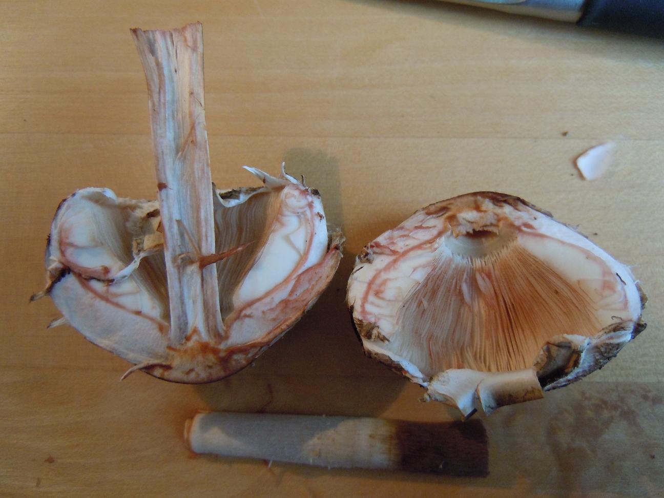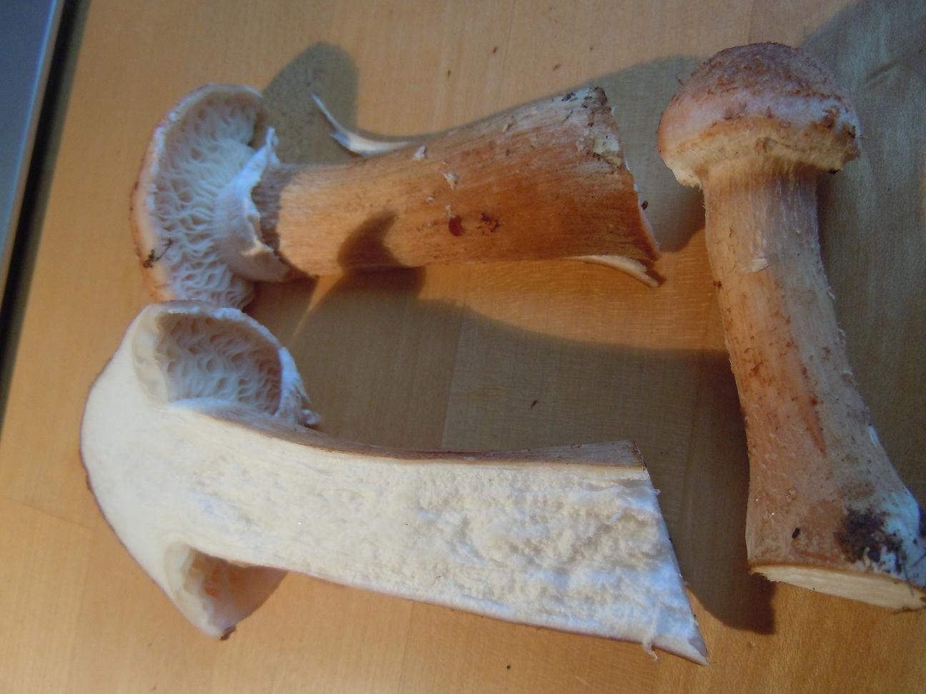 Bei der anderen Kollektion sind rote Fraßstellen am Hut, der stiel sieht von außen fast gleich aus, allerdings hatte ich es noch nie dass der Stiel von innen so extrem rot wird. Habe die schon 2-3mal gesammelt und gegessen, aber wie gesagt da war der Stiel nicht so extrem rot von innen. Das Fleisch ist weißlich-hellgelb.