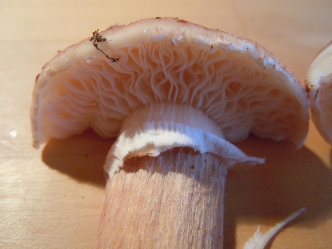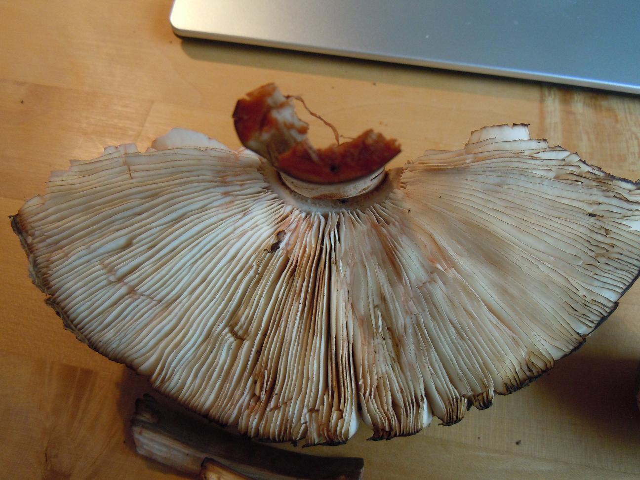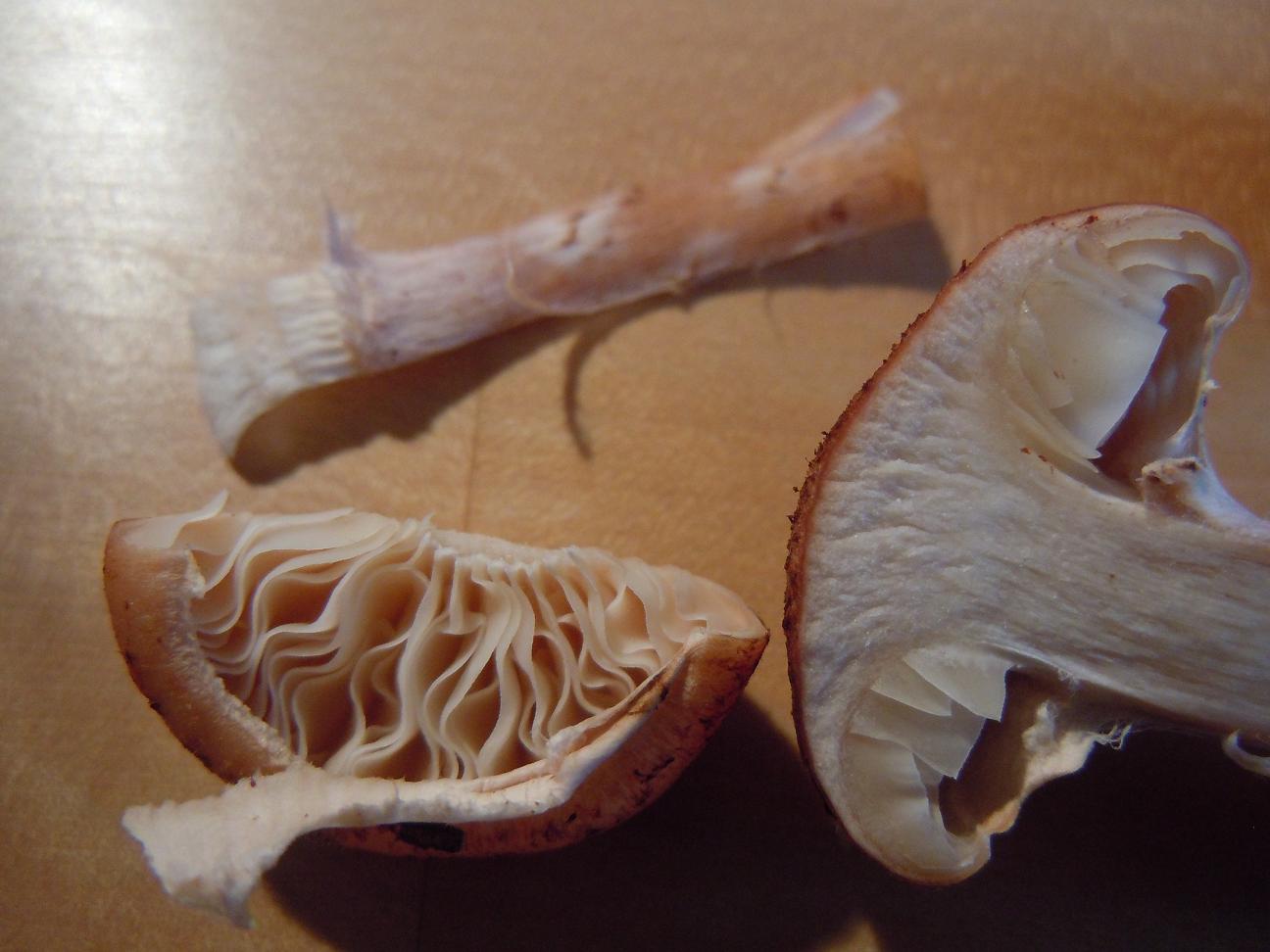Die Lamellen stehen sehr eng und sind fast weiß, teils leicht bräunlich verfärbt.