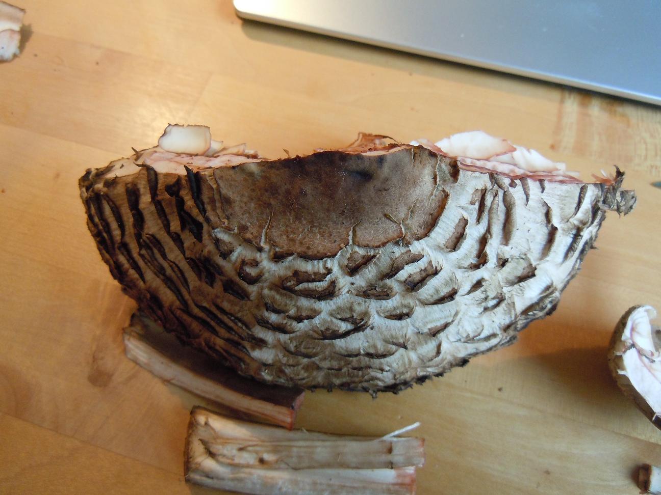 Die Haut vom Hut ist dunkelbraun, das Fleisch weiß. Und der Pilz wiegt ganz gut was. Die Haut vom Hut lässt sich nicht abziehen. Mich verwirrt nur etwas die Farbe vom Stiel wobei der glaub ich einfach vom Dreck so schwarz aussieht.