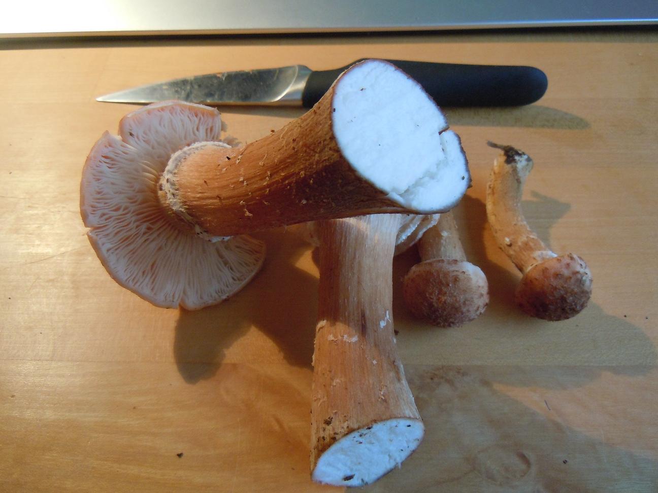 Der 1. Pilz verfärbt sich sehr schön safranfarbend sobald man ihn anschneidet. Die Jungen Pilze sind noch geschlossen, sodass man die Lamellen nicht sehen kann. Von der Größe her waren sie sehr unterschiedlich, habe einen großen mit 13cm Hutdurchmesser und die kleinen mit eher 2-5 cm Durchmesser. Höhe ca. 6-15cm. Riechen lecker nach Pilz und der Stiel ist im jungen Alter meist dick an der Basis.