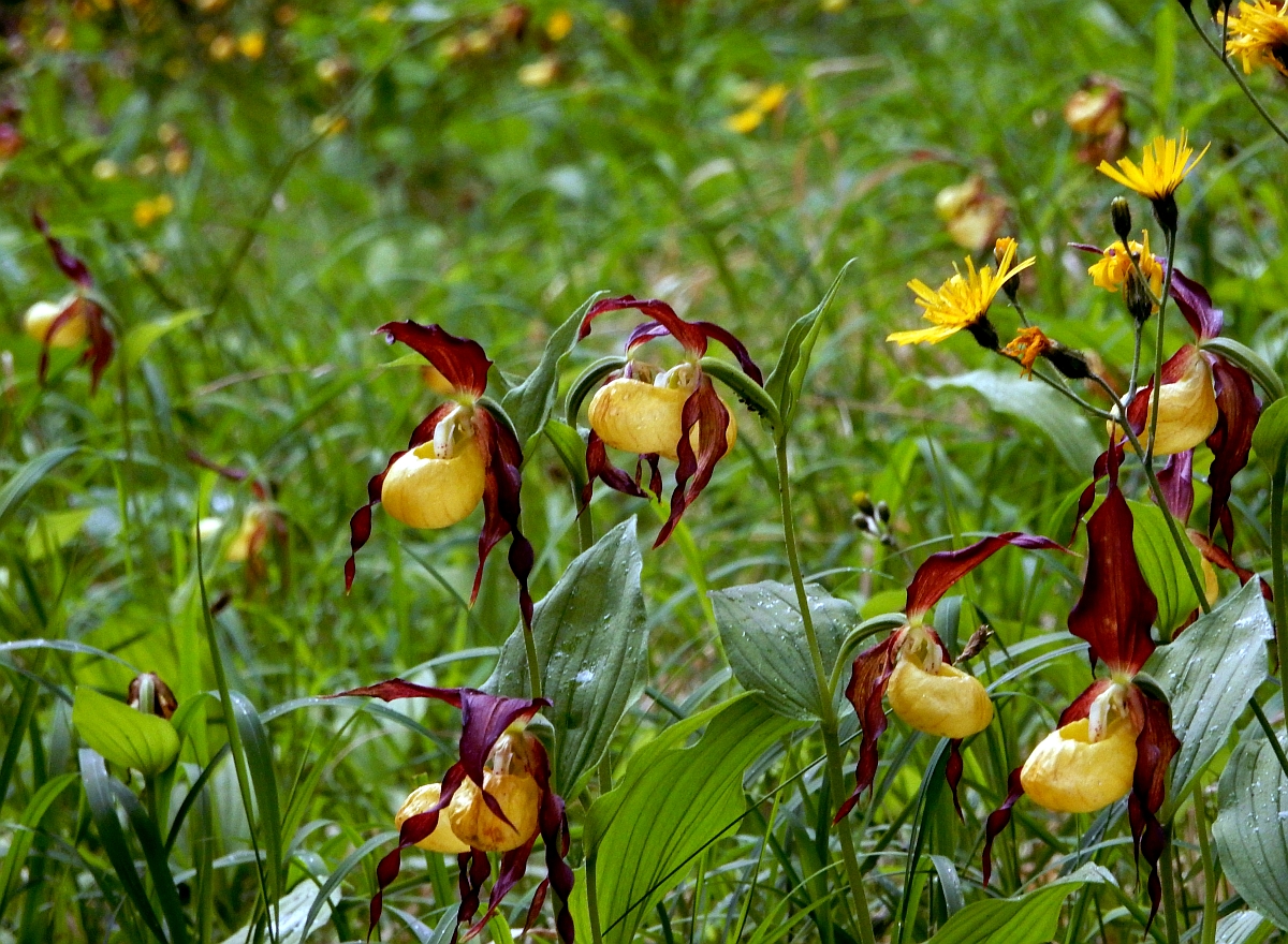 Am Bettelborn stehen neben welken Frauenschuhen auch noch etliche in schönstem Blütenstand. Der Bestand ist zwar sehr überschaubar aber von hunderten Pflanzen besiedelt.