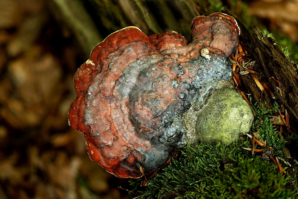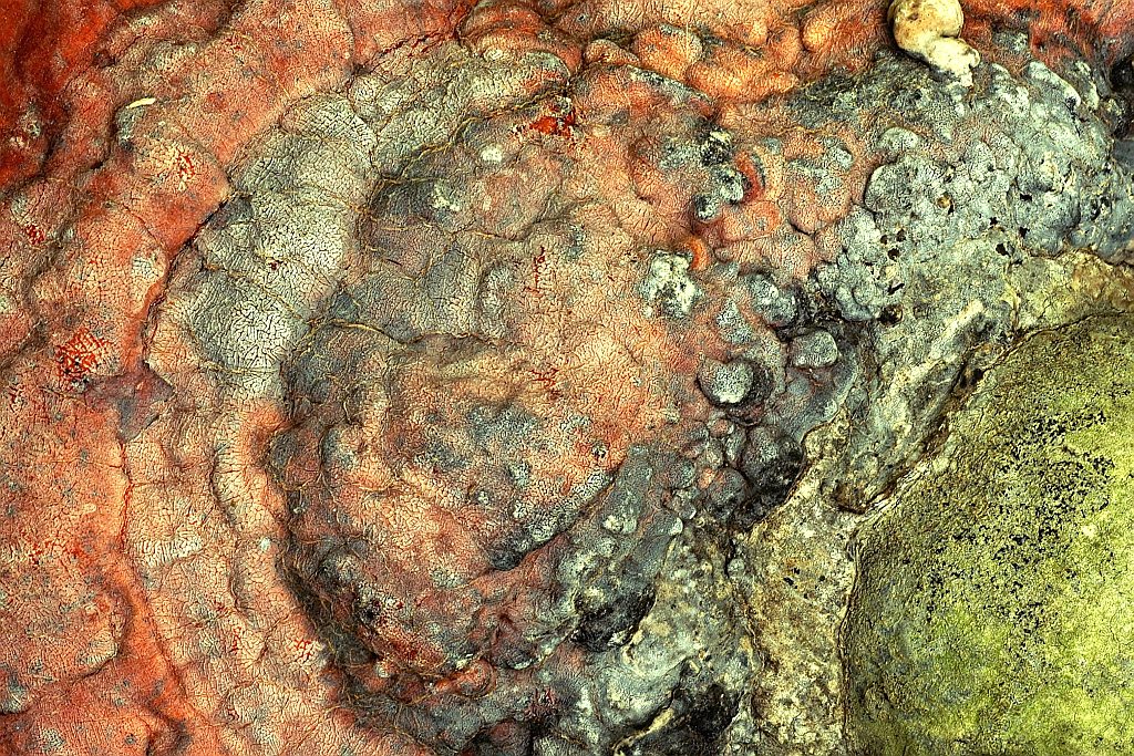 Im selben Gebiet wuchs Mitte/Ende Juni sehr zahlreich die kommende Generation des nördlichen Zinnoberschwammes heran, vorerst noch mit wenigen ausgebildeten Fruchtkörpern, dafür aber mit einem faszinierendem orange-rotem Geflecht wie Magmaströme, dass die Oberfläche einiger liegender Buchenstämme durchzog. Eigentlich finde ich den frisch erst immer im Herbst und dann an Kirschen.