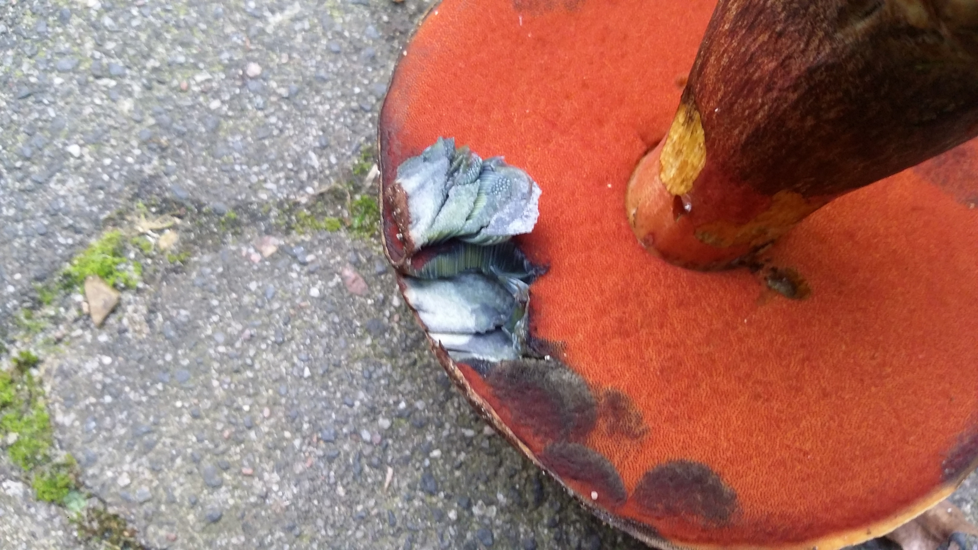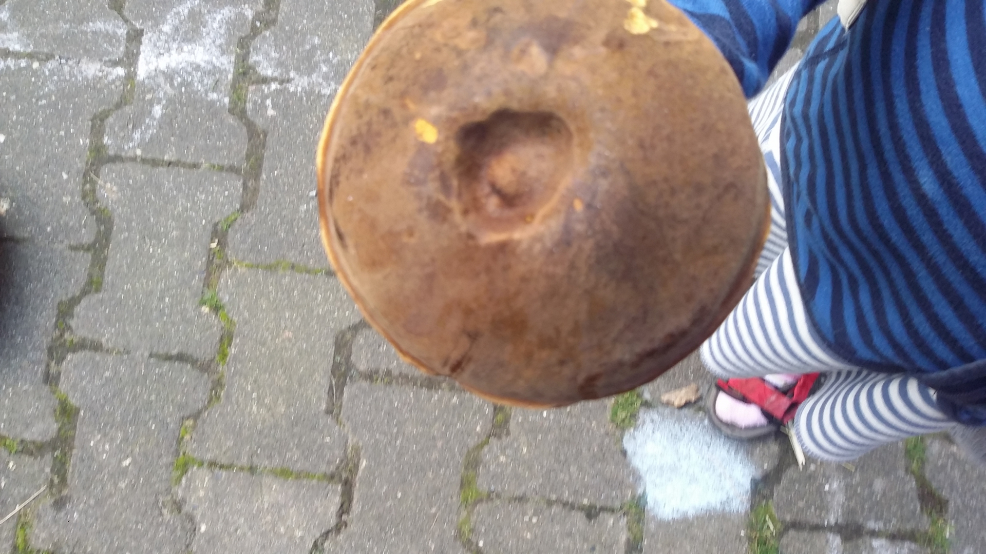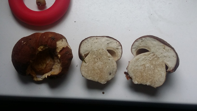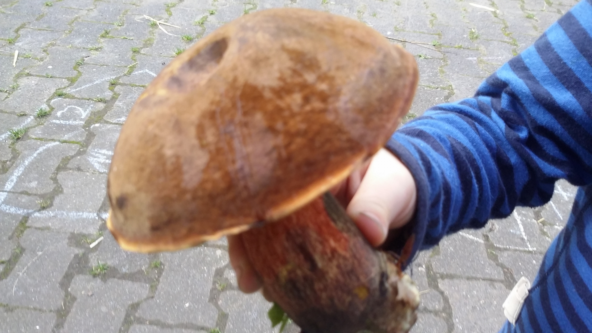 Der Stiel ist deutlich anders, als bei den kleineren Exemplaren zuvor. Was ist das? Wir haben noch nie einen sooo großen Röhrenpilz gesehen.