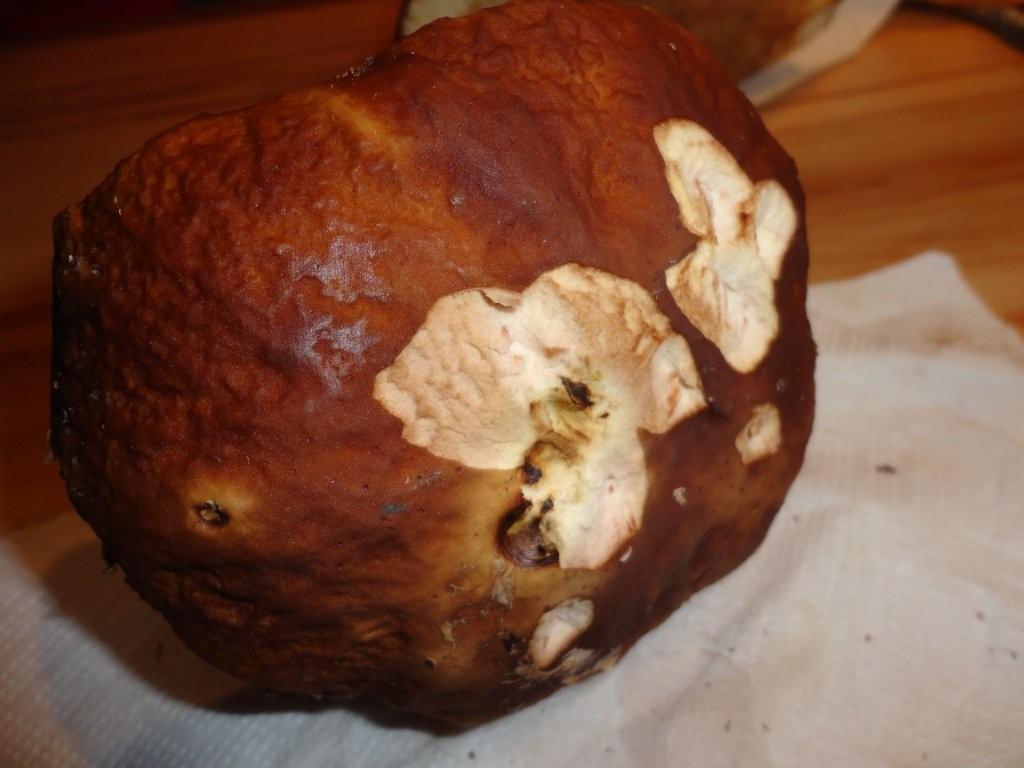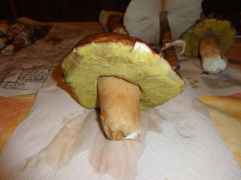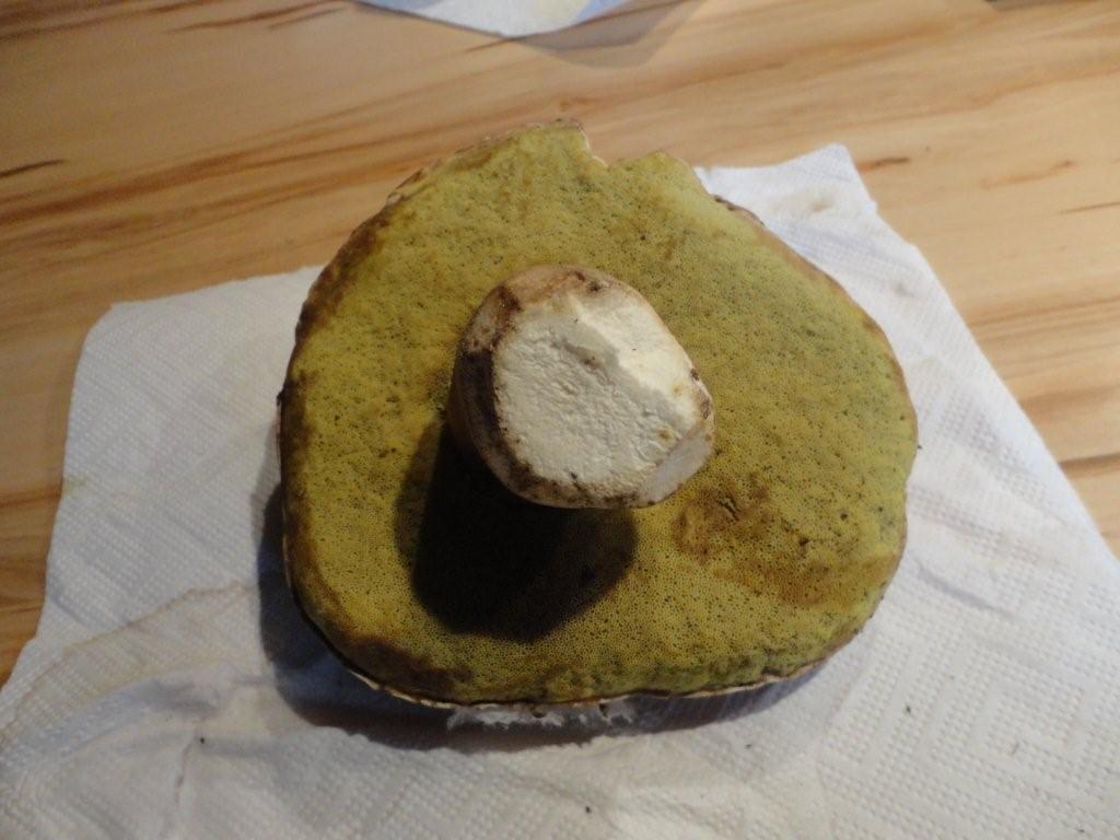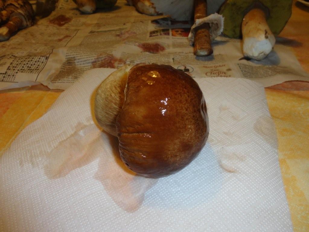 Die älten mit Hut bis 15 cm mit gelben Schwamm, bräunt an den Verletzungen
