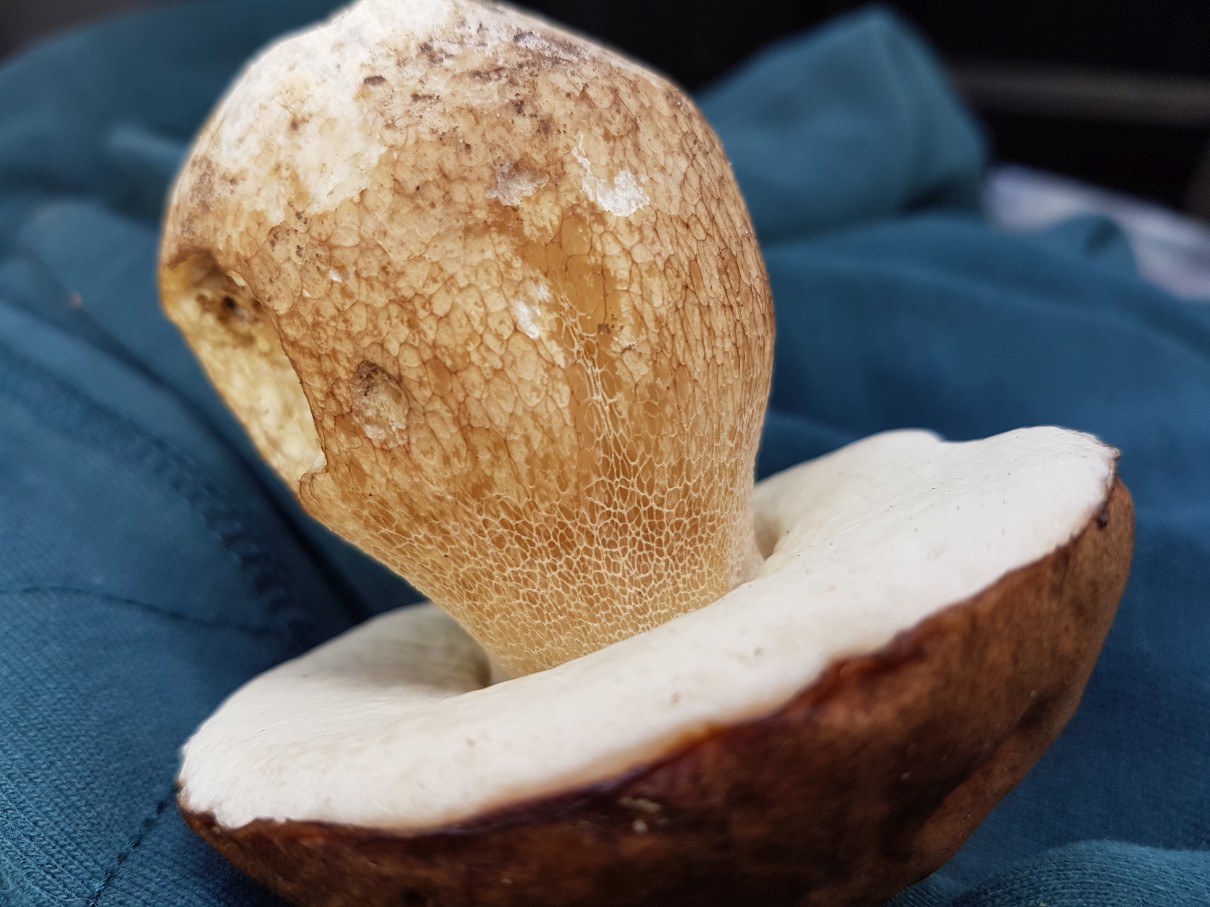 Gerade lese ich bei 123 Pilze, dass auch der Sommersteinpilz ein bräunlich überfasertes Netz hat. Und da dieses Exemplar ja schon älter war und keinerlei Rosa Töne im Fleisch zu sehen waren, hake ich den letztendlich doch als meinen Erstfund Sommersteinpilz ab.