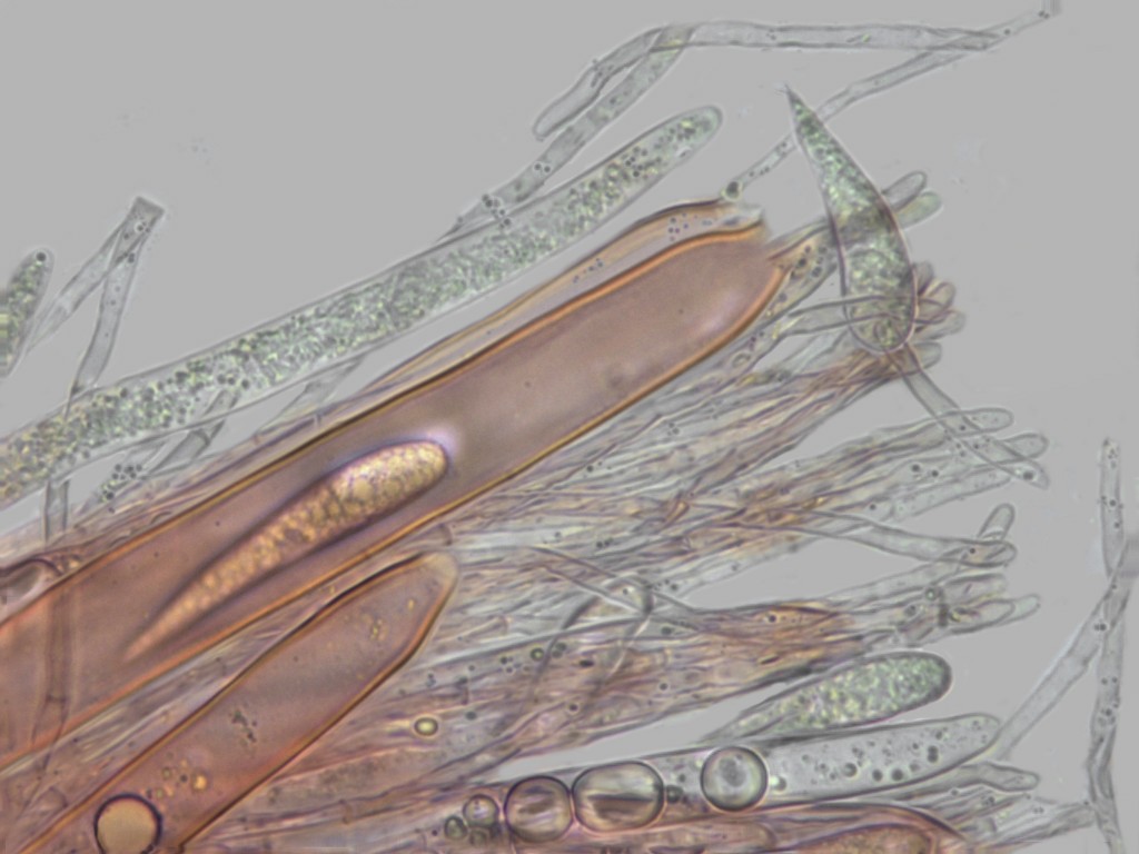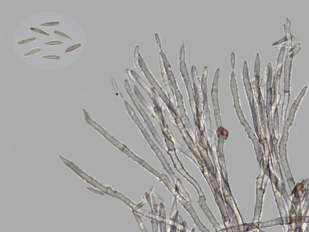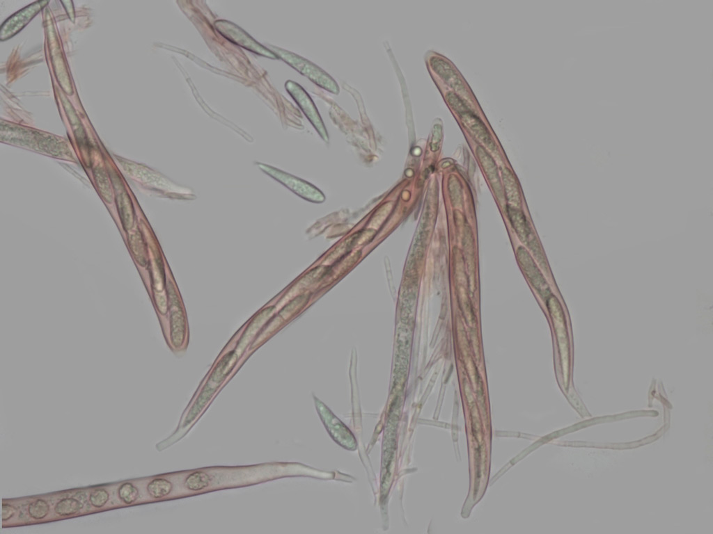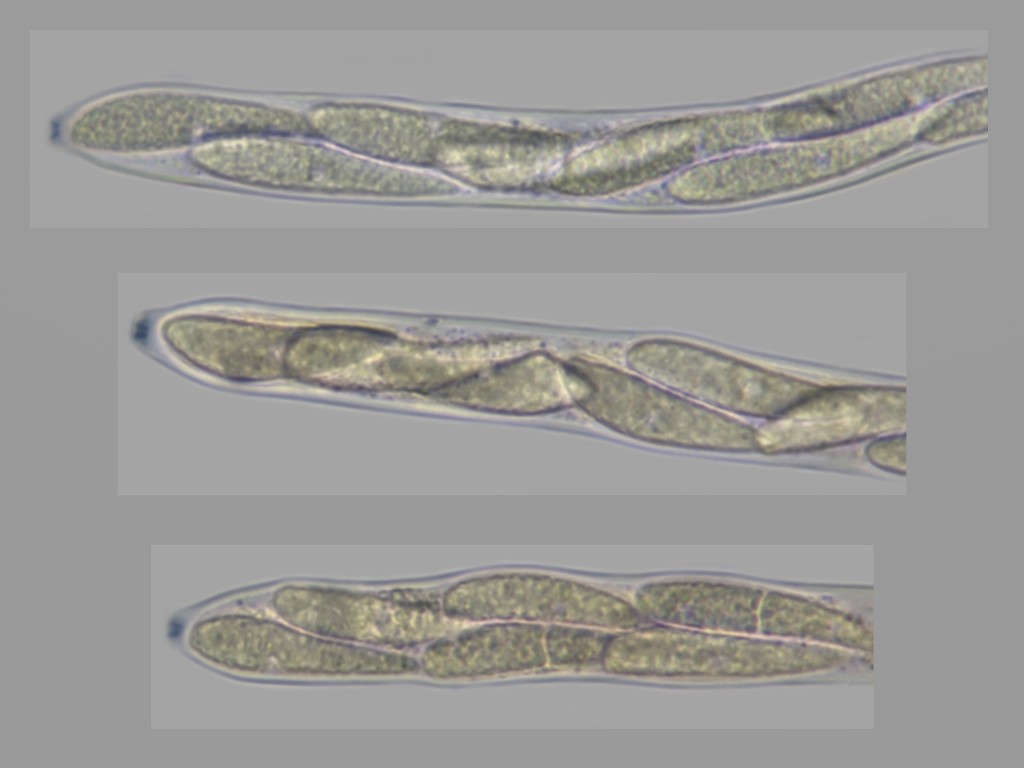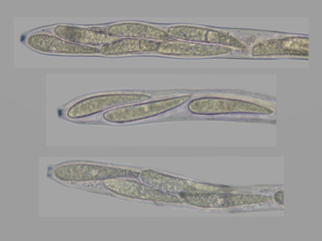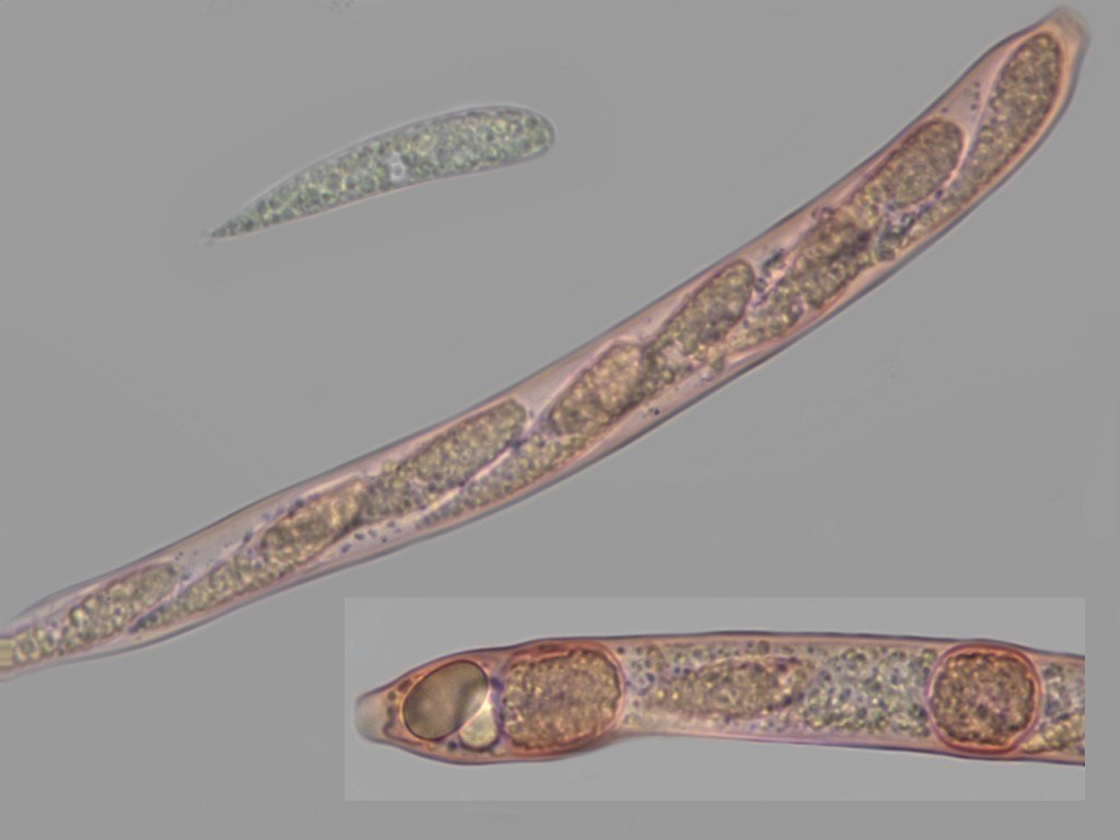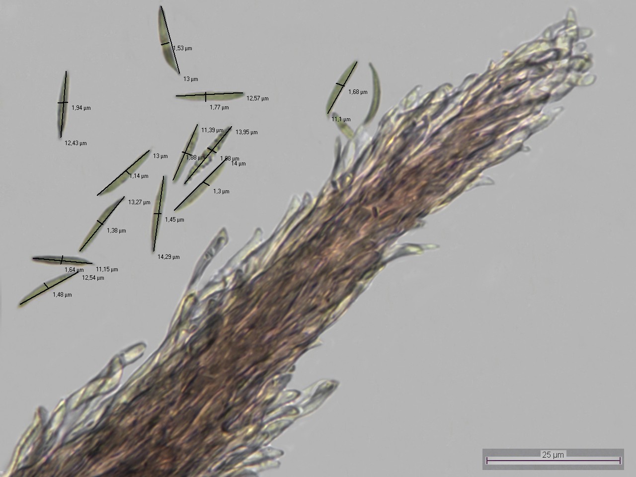 3 Fruchtkörper 3-4 mm im Durchmesser, kurzstielig, Asci 140,4 x 13,6, IKI+, Haken-, Sporen im Mittel 34,63 x 6,45 (Q=5,45) scutuloid, gekrümmt und mit 1 bis 3 Setulae am Ende. Einige Sporen im Ascus mit einer Septe. Die Bestimmung erfolgt nach Declercq (2004) und Baral & Bemmann Ascomycete.org, 5 (4) : 109-128. Oktobre 2013. Wir haben den Fund als