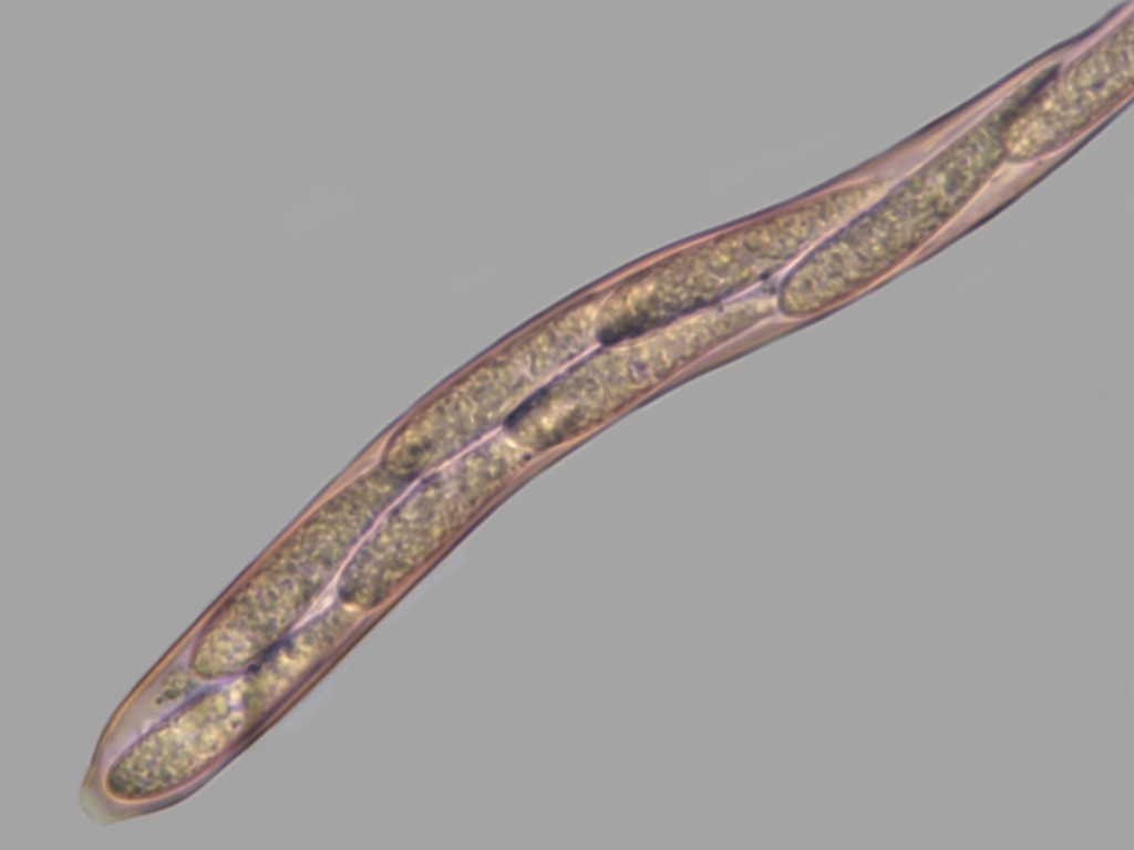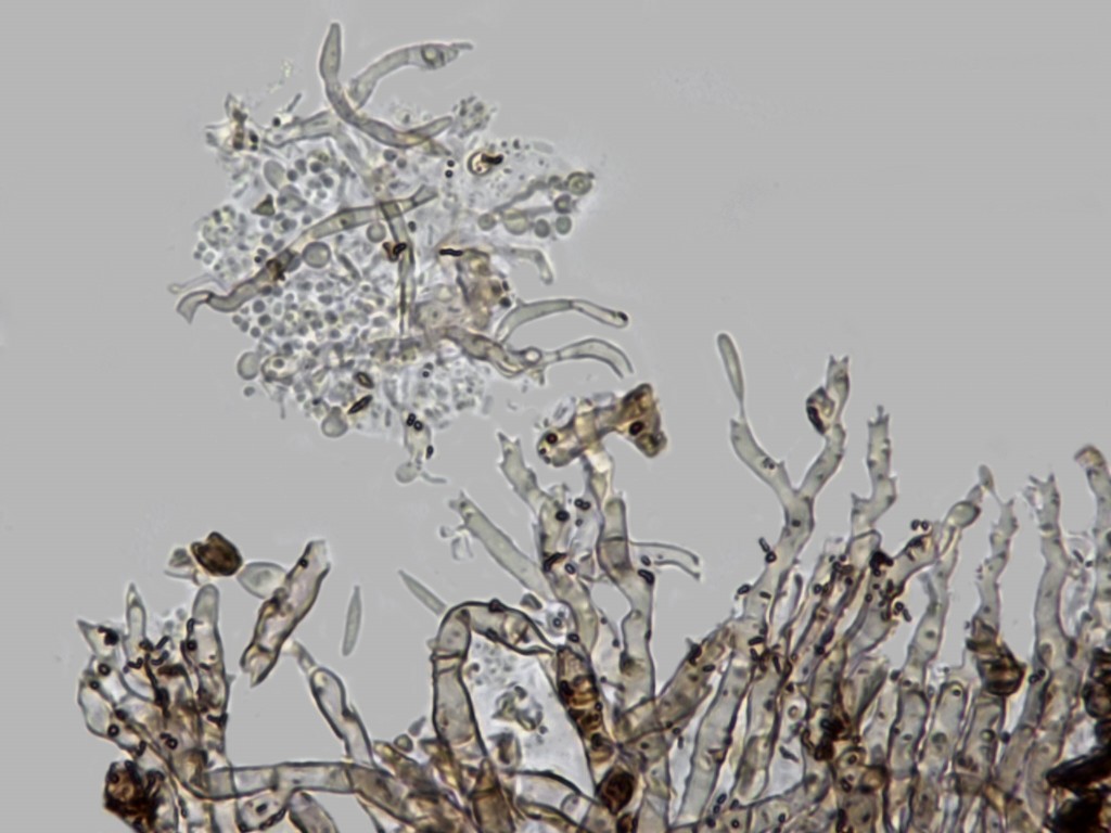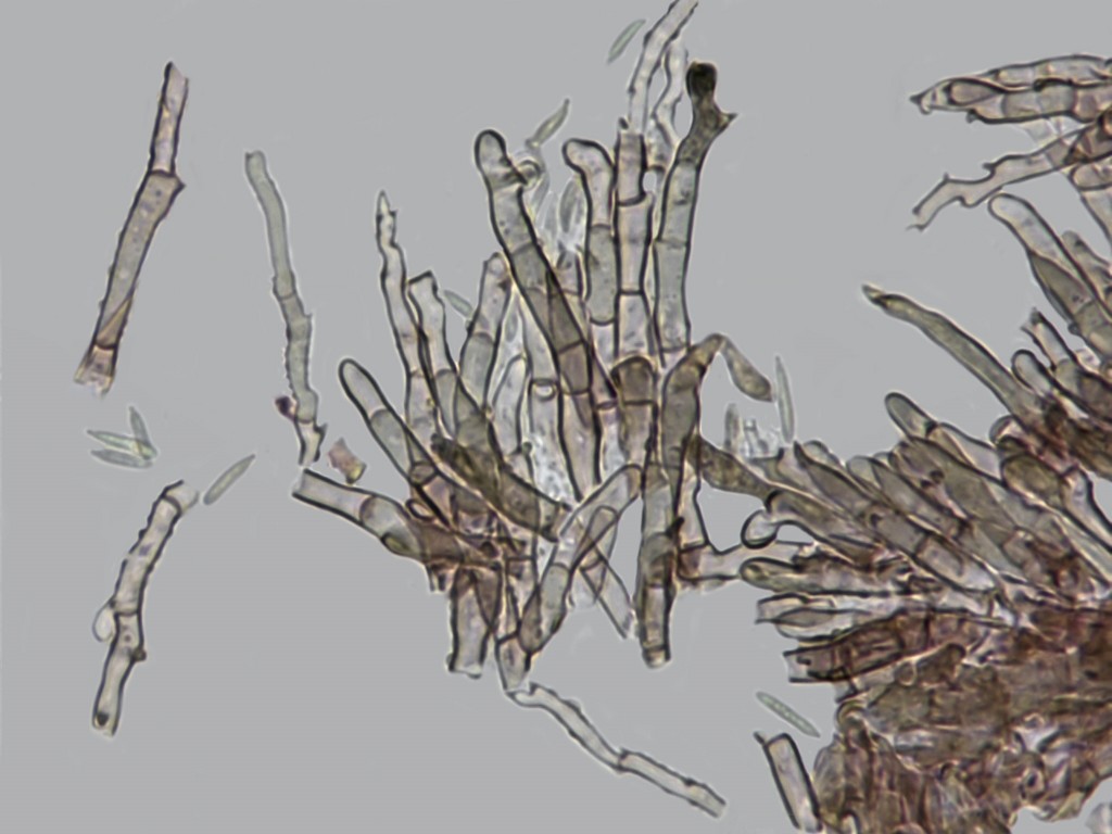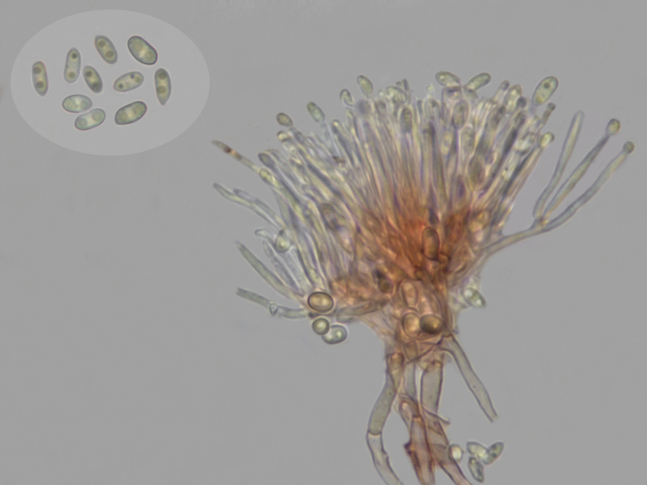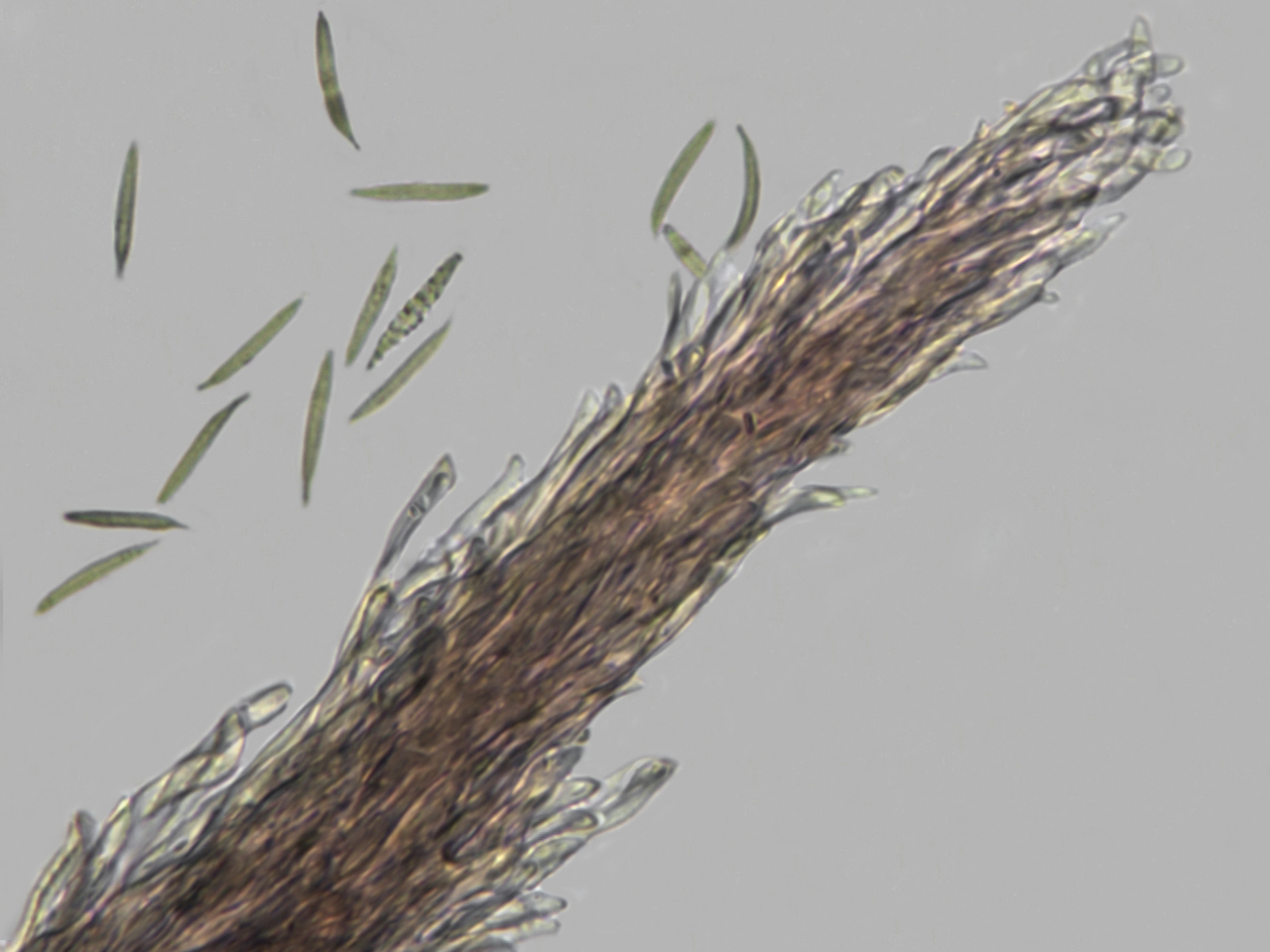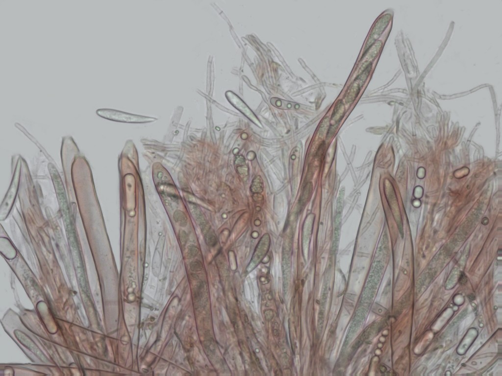 3 Fruchtkörper 3-4 mm im Durchmesser, kurzstielig, Asci 140,4 x 13,6, IKI+, Haken-, Sporen im Mittel 34,63 x 6,45 (Q=5,45) scutuloid, gekrümmt und mit 1 bis 3 Setulae am Ende. Einige Sporen im Ascus mit einer Septe. Die Bestimmung erfolgt nach Declercq (2004) und Baral & Bemmann Ascomycete.org, 5 (4) : 109-128. Oktobre 2013. Wir haben den Fund als