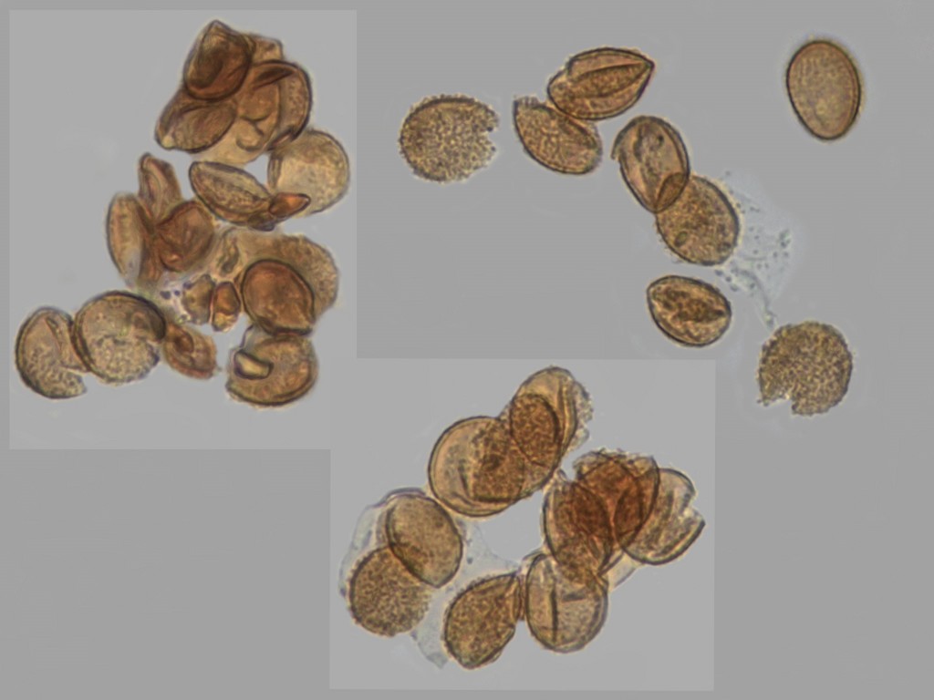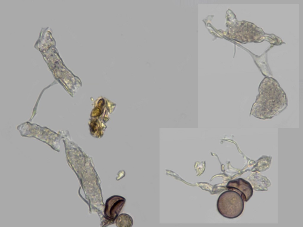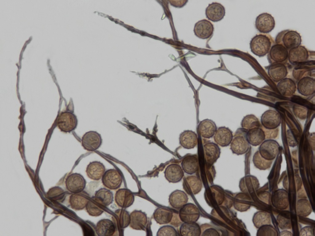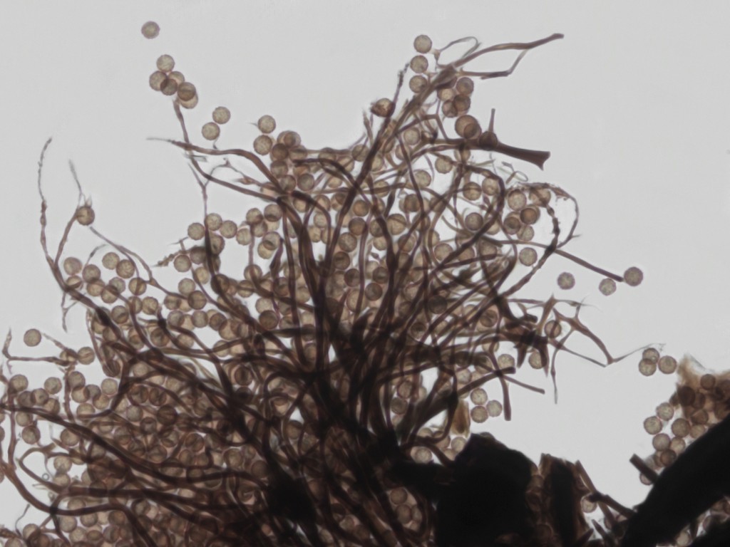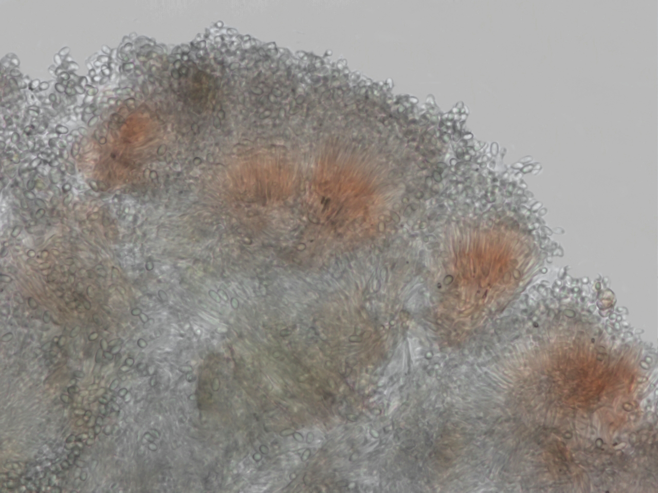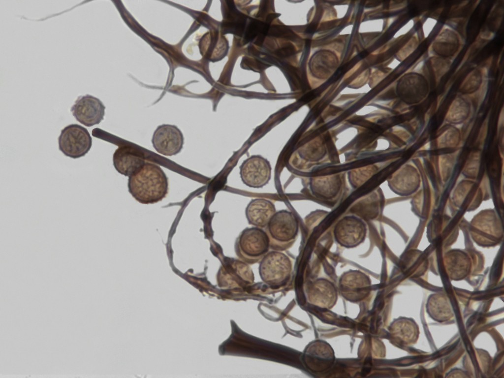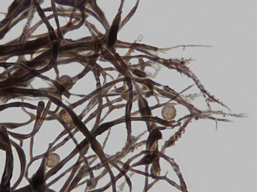 3 Fruchtkörper 3-4 mm im Durchmesser, kurzstielig, Asci 140,4 x 13,6, IKI+, Haken-, Sporen im Mittel 34,63 x 6,45 (Q=5,45) scutuloid, gekrümmt und mit 1 bis 3 Setulae am Ende. Einige Sporen im Ascus mit einer Septe. Die Bestimmung erfolgt nach Declercq (2004) und Baral & Bemmann Ascomycete.org, 5 (4) : 109-128. Oktobre 2013. Wir haben den Fund als