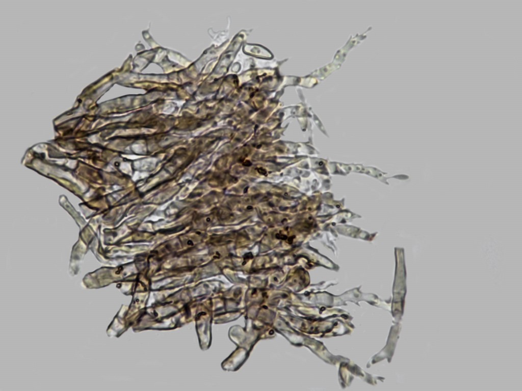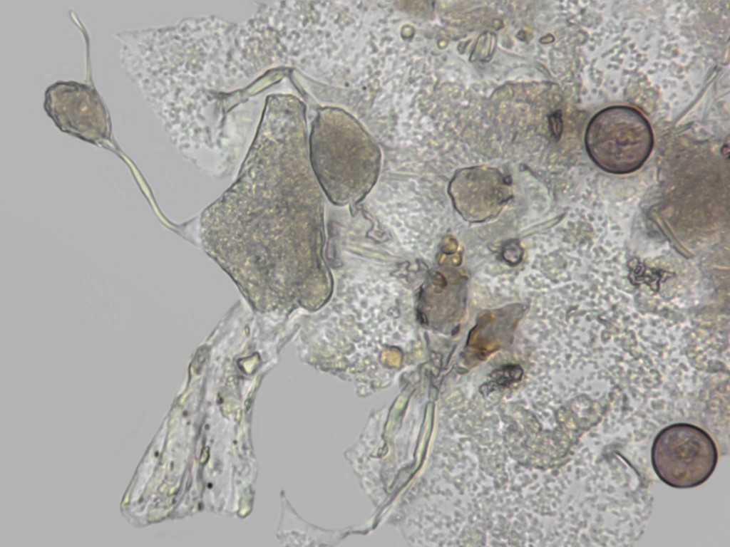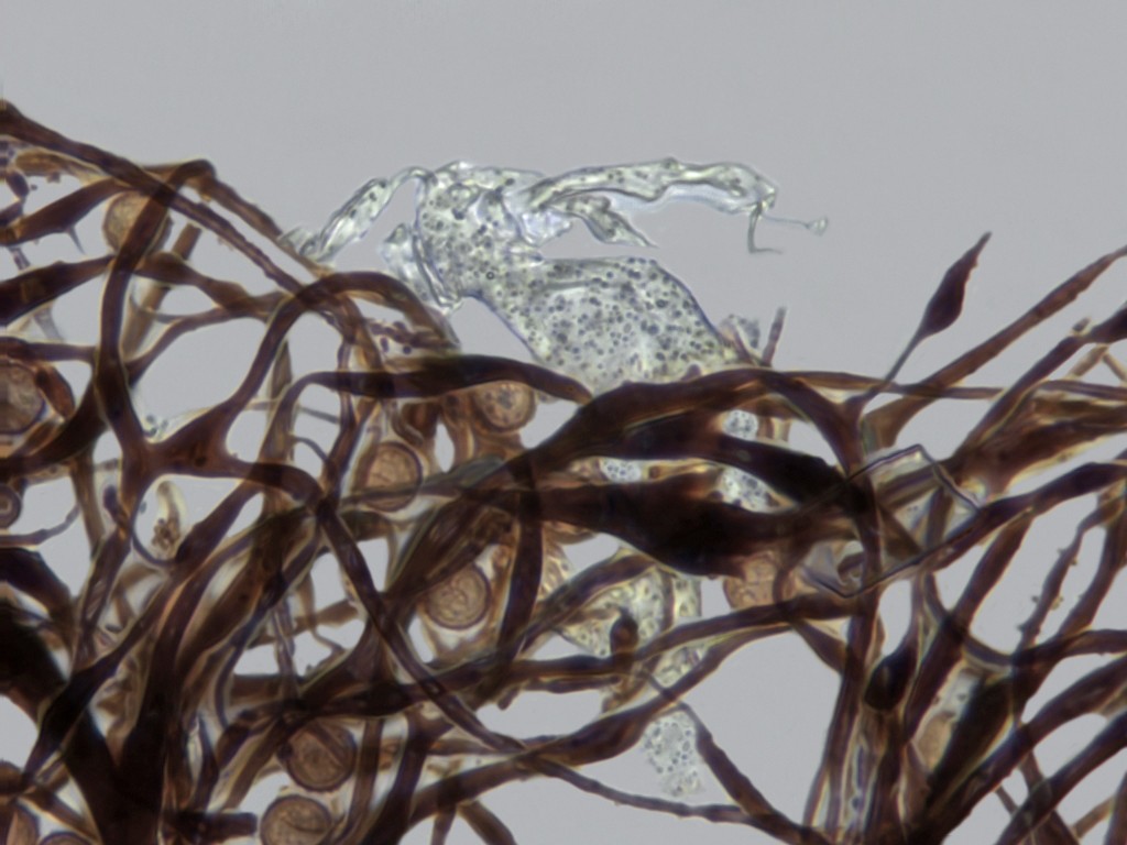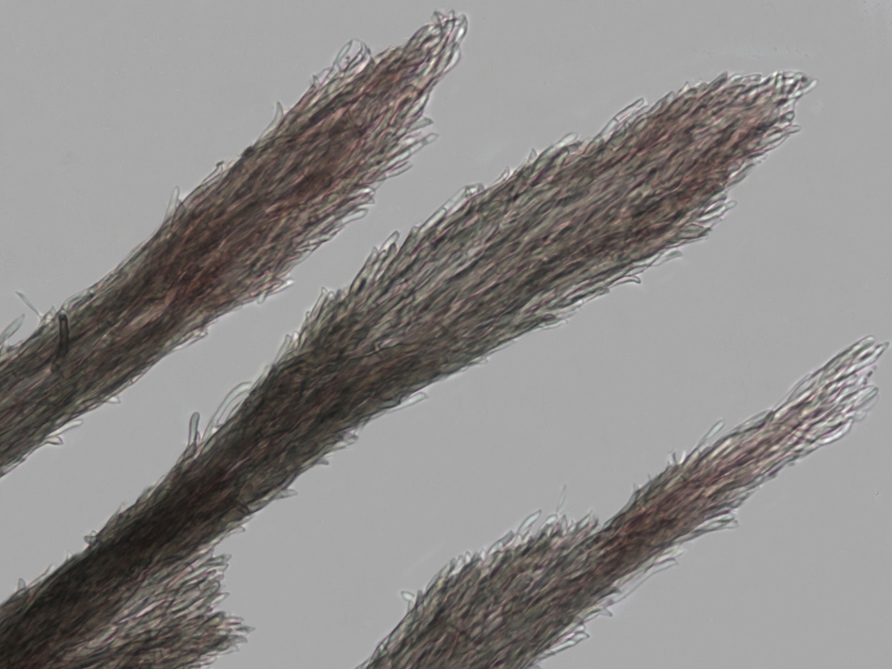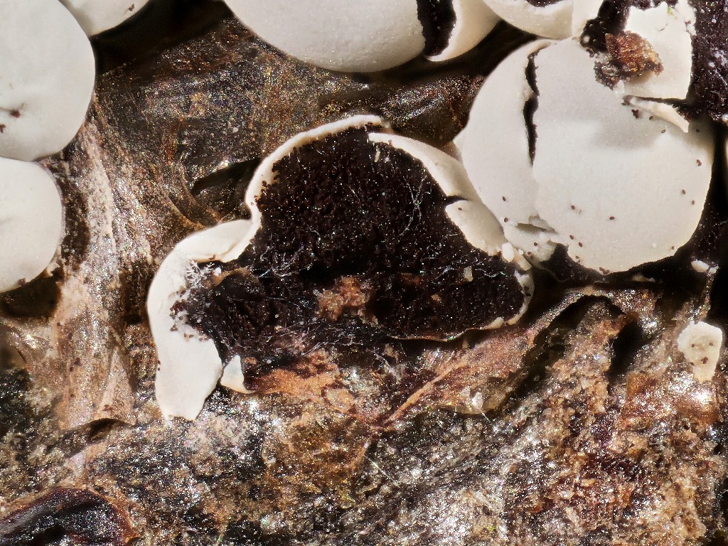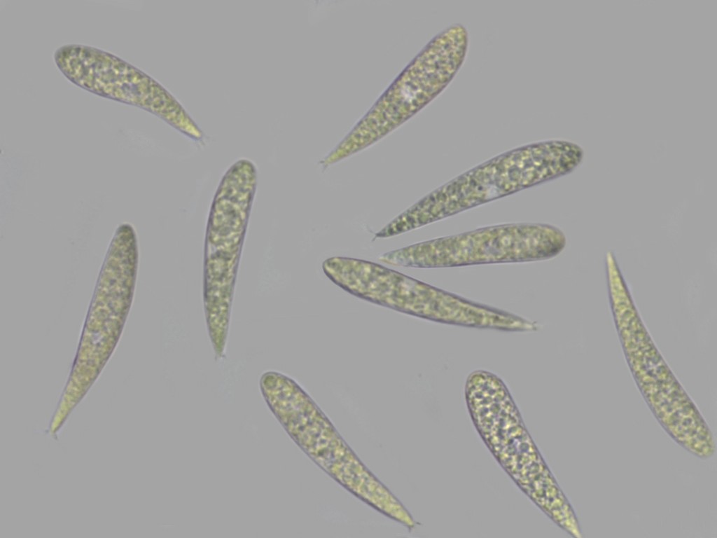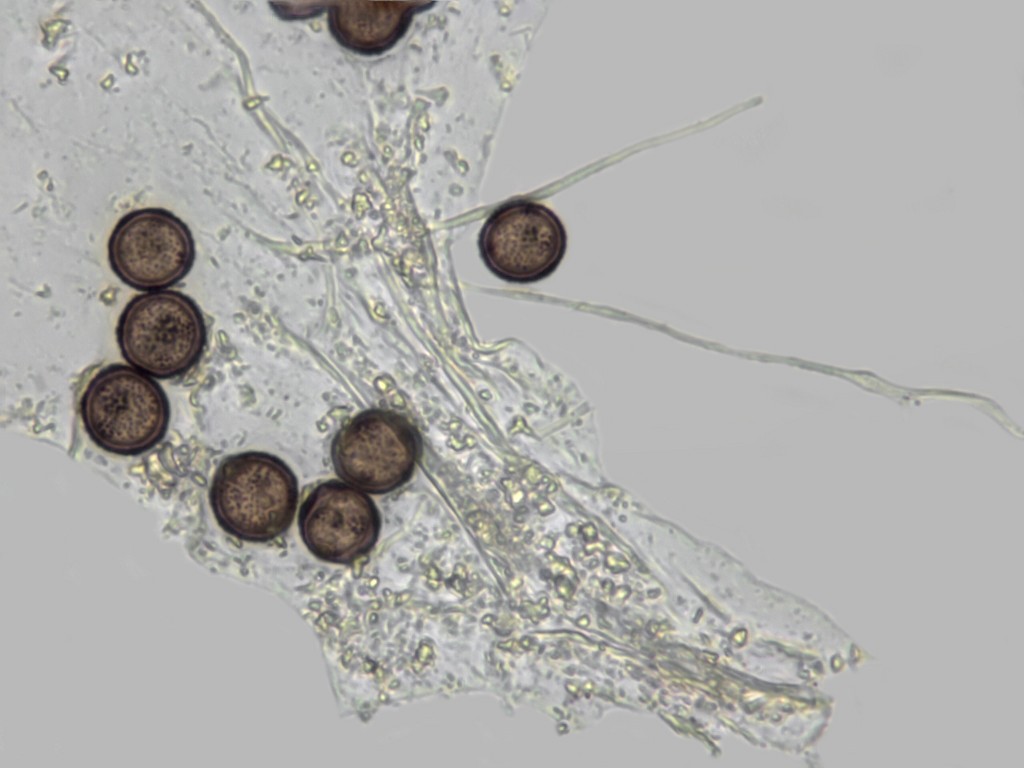 3 Fruchtkörper 3-4 mm im Durchmesser, kurzstielig, Asci 140,4 x 13,6, IKI+, Haken-, Sporen im Mittel 34,63 x 6,45 (Q=5,45) scutuloid, gekrümmt und mit 1 bis 3 Setulae am Ende. Einige Sporen im Ascus mit einer Septe. Die Bestimmung erfolgt nach Declercq (2004) und Baral & Bemmann Ascomycete.org, 5 (4) : 109-128. Oktobre 2013. Wir haben den Fund als