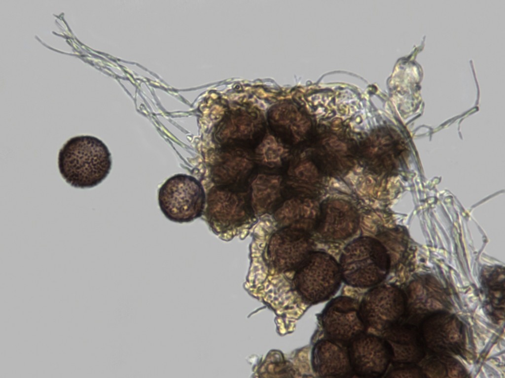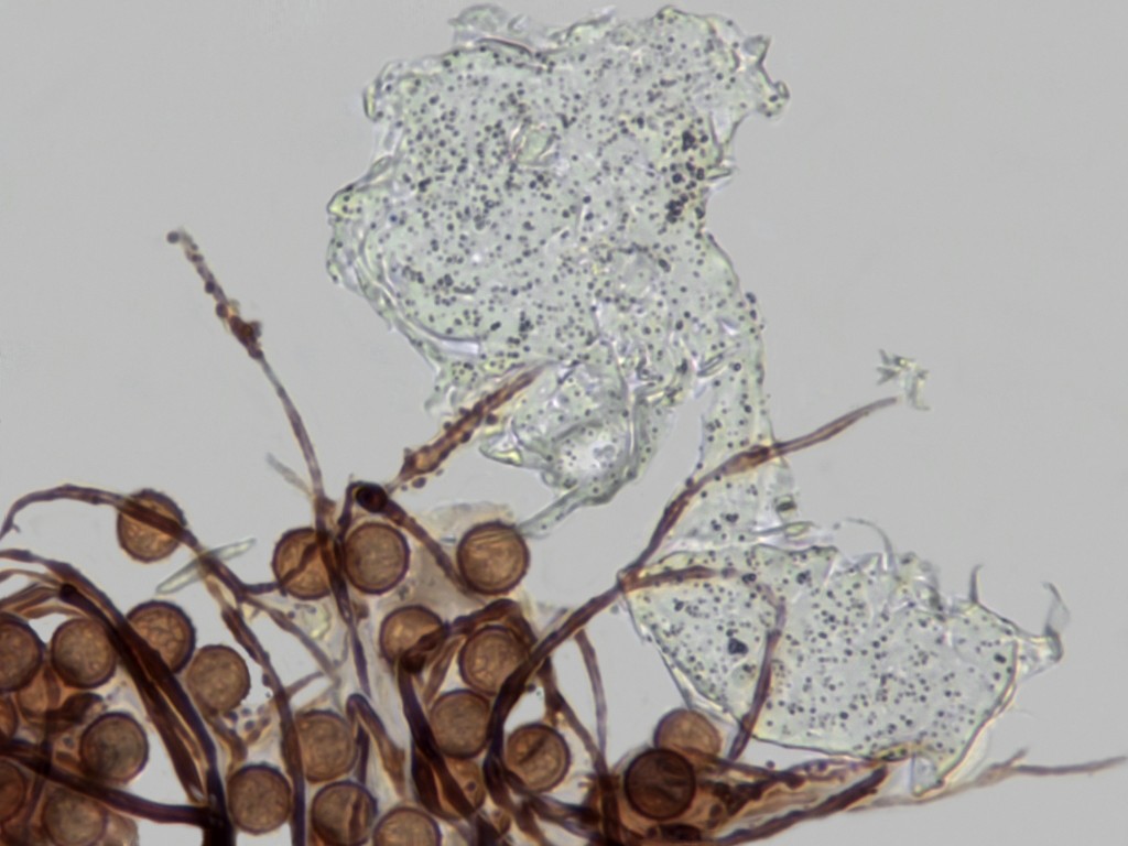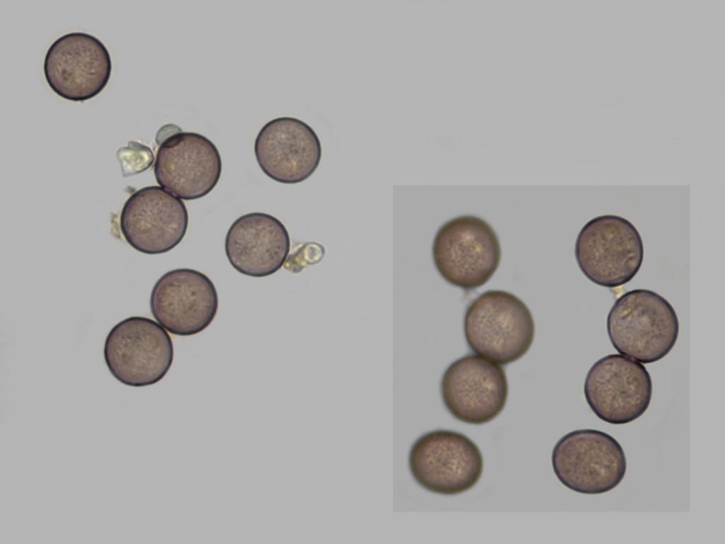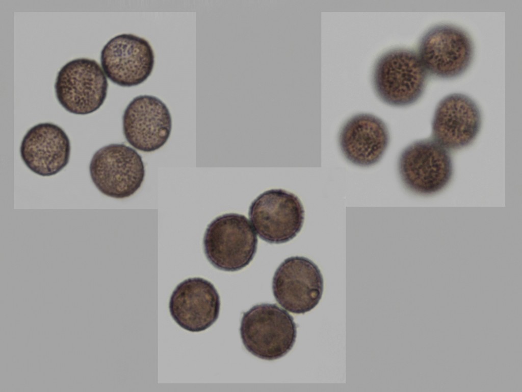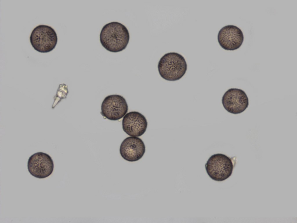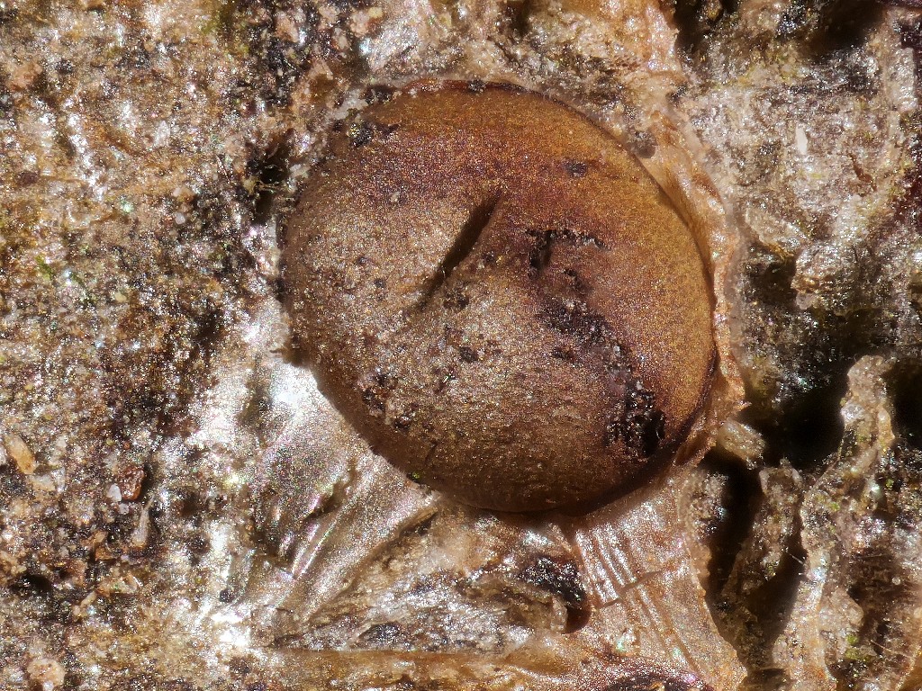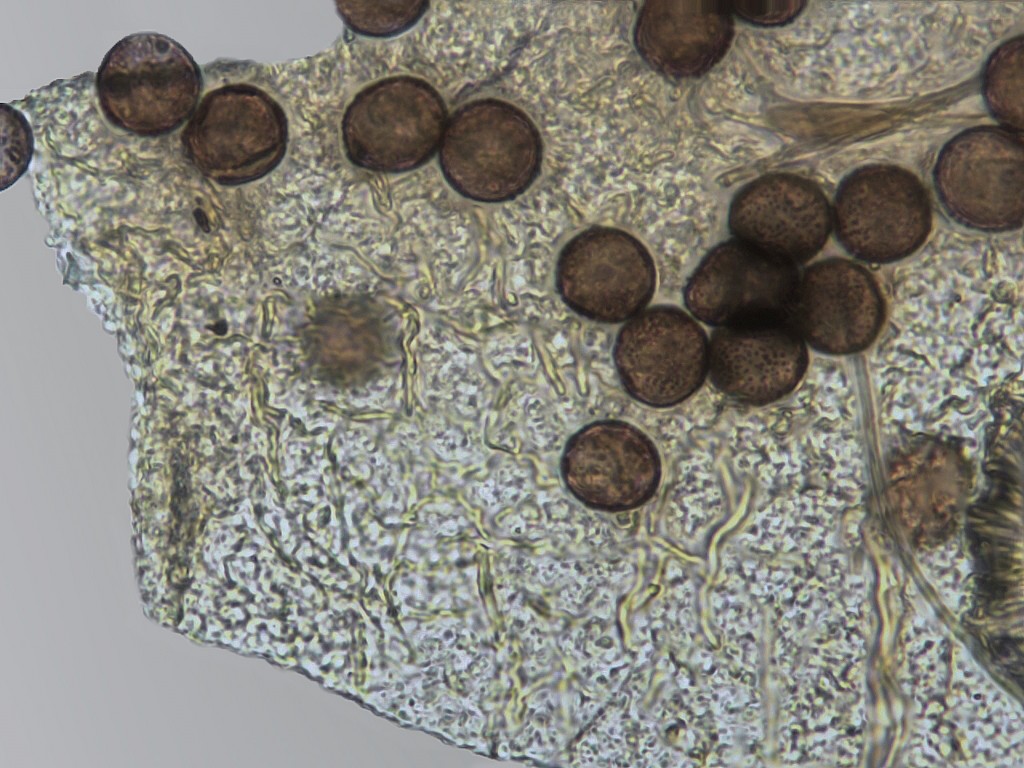 3 Fruchtkörper 3-4 mm im Durchmesser, kurzstielig, Asci 140,4 x 13,6, IKI+, Haken-, Sporen im Mittel 34,63 x 6,45 (Q=5,45) scutuloid, gekrümmt und mit 1 bis 3 Setulae am Ende. Einige Sporen im Ascus mit einer Septe. Die Bestimmung erfolgt nach Declercq (2004) und Baral & Bemmann Ascomycete.org, 5 (4) : 109-128. Oktobre 2013. Wir haben den Fund als