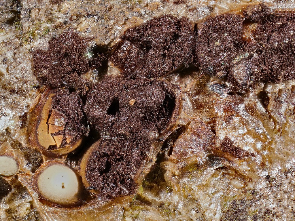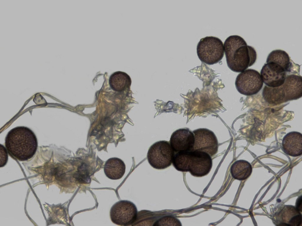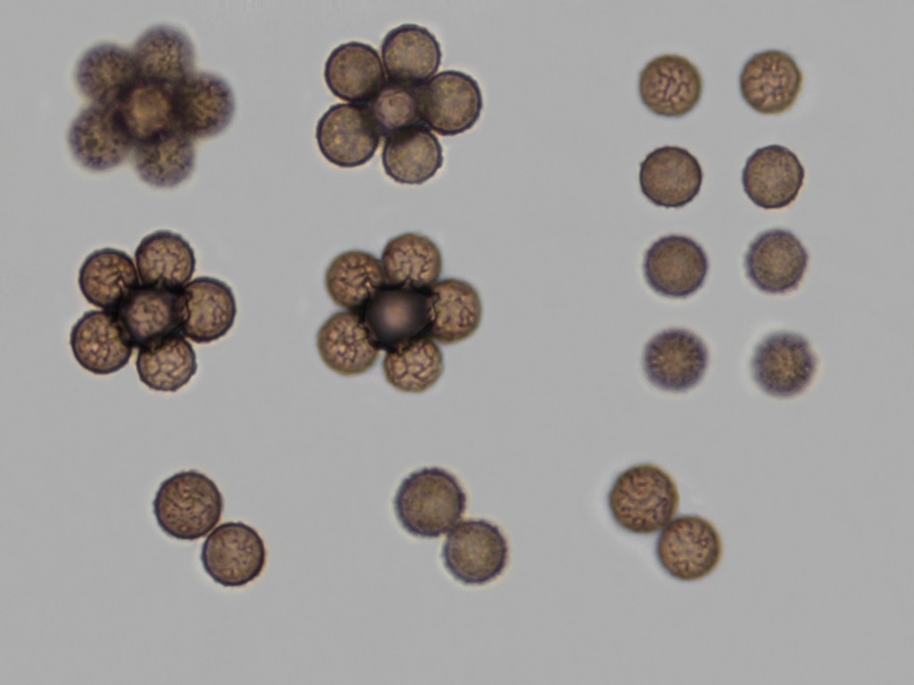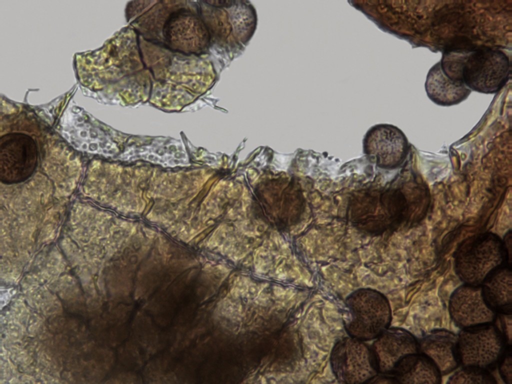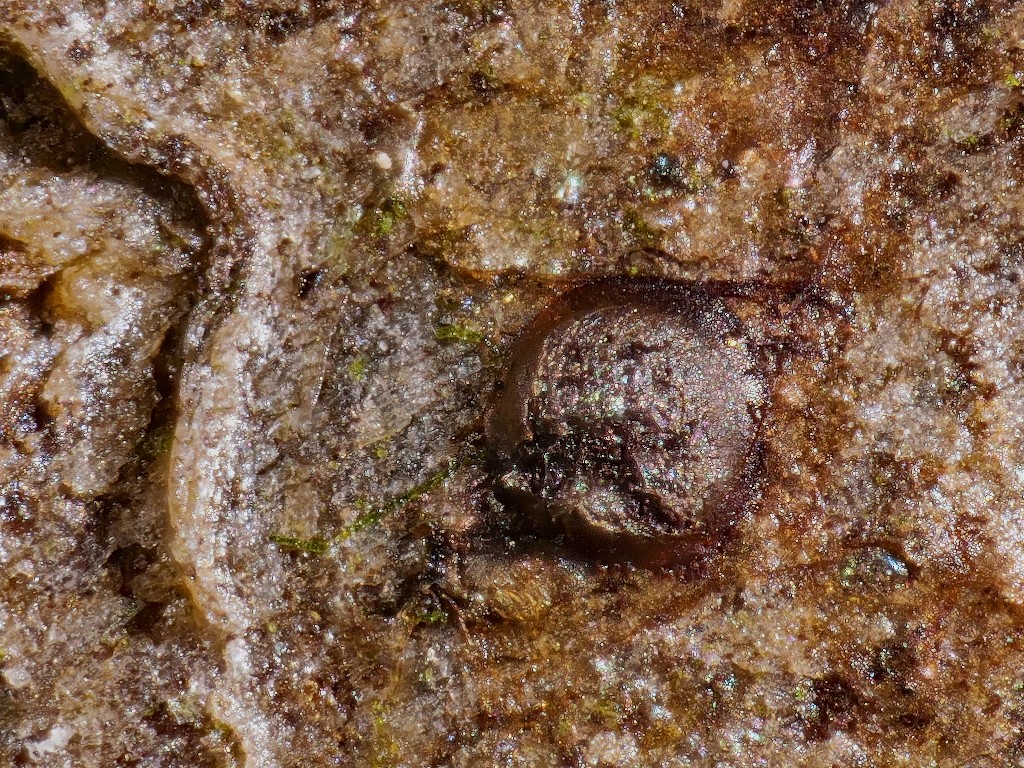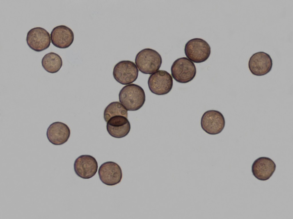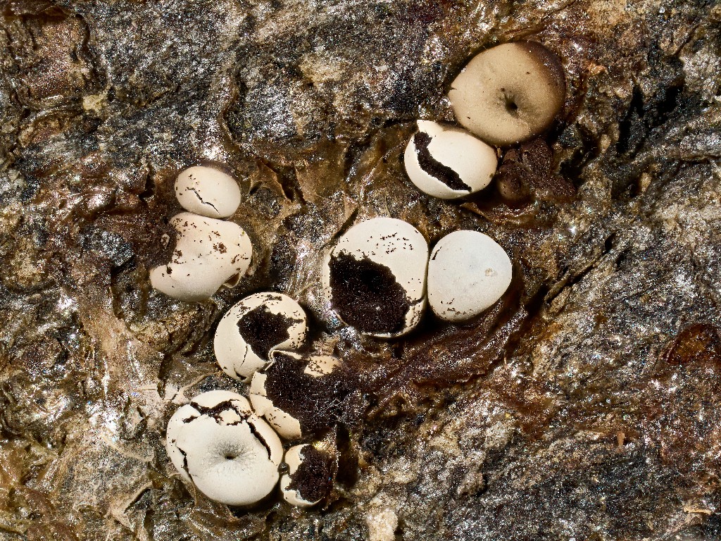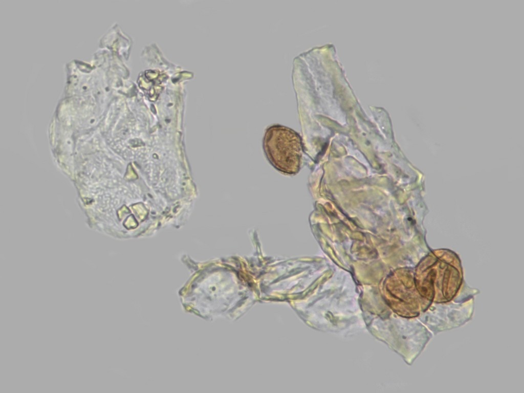 3 Fruchtkörper 3-4 mm im Durchmesser, kurzstielig, Asci 140,4 x 13,6, IKI+, Haken-, Sporen im Mittel 34,63 x 6,45 (Q=5,45) scutuloid, gekrümmt und mit 1 bis 3 Setulae am Ende. Einige Sporen im Ascus mit einer Septe. Die Bestimmung erfolgt nach Declercq (2004) und Baral & Bemmann Ascomycete.org, 5 (4) : 109-128. Oktobre 2013. Wir haben den Fund als