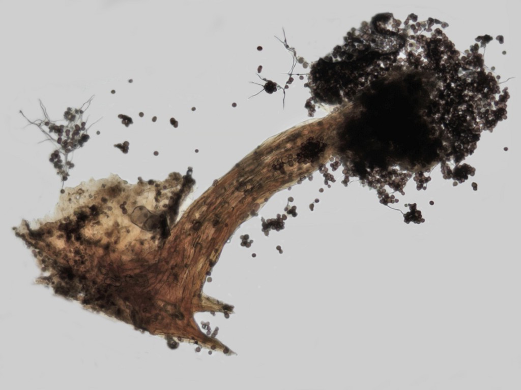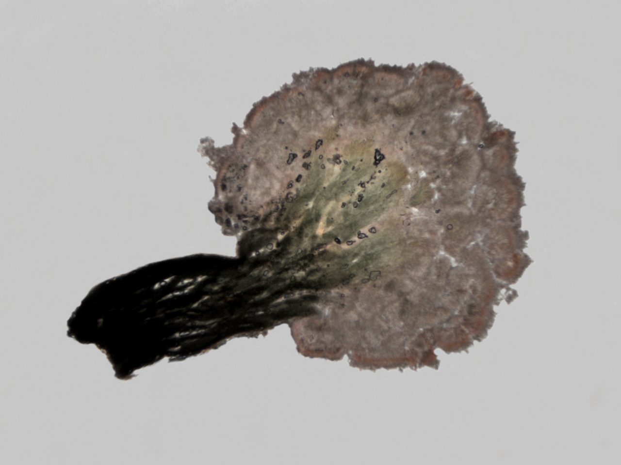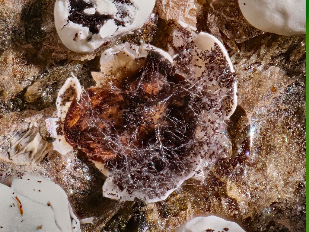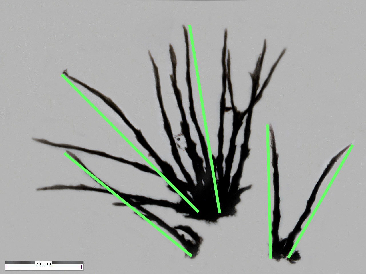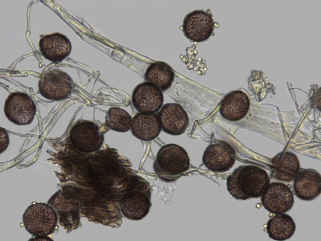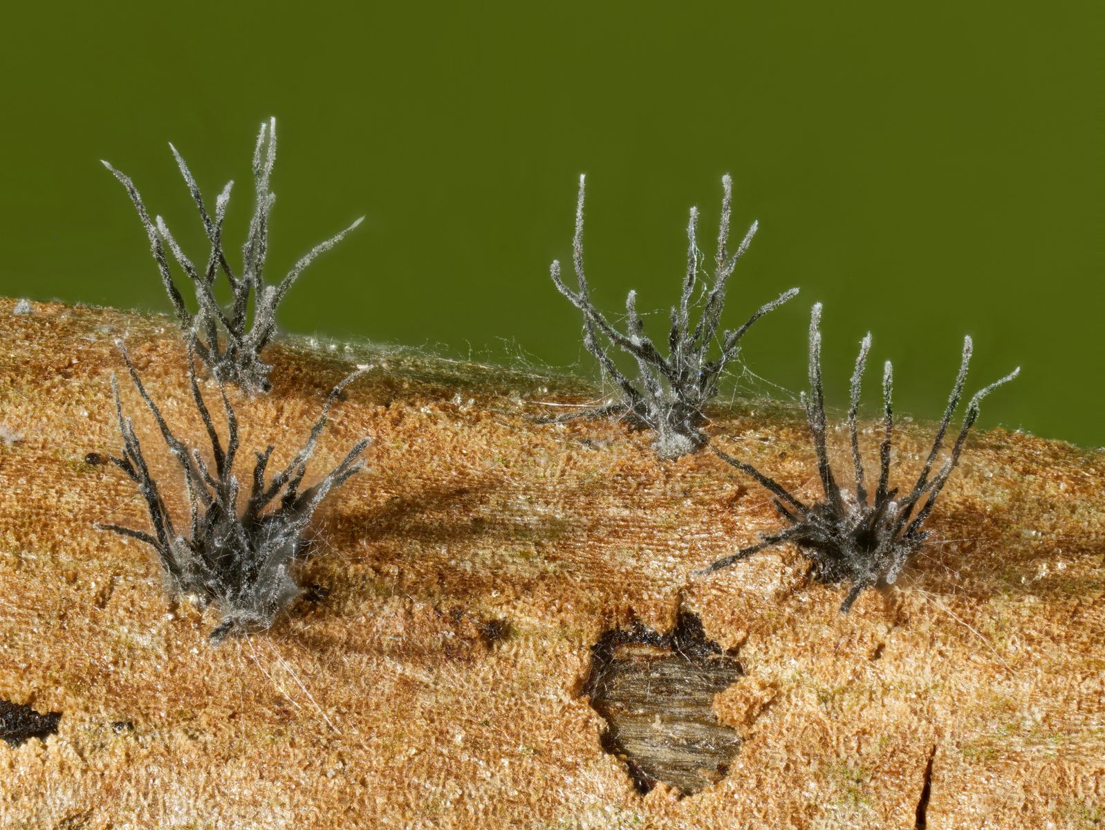 3 Fruchtkörper 3-4 mm im Durchmesser, kurzstielig, Asci 140,4 x 13,6, IKI+, Haken-, Sporen im Mittel 34,63 x 6,45 (Q=5,45) scutuloid, gekrümmt und mit 1 bis 3 Setulae am Ende. Einige Sporen im Ascus mit einer Septe. Die Bestimmung erfolgt nach Declercq (2004) und Baral & Bemmann Ascomycete.org, 5 (4) : 109-128. Oktobre 2013. Wir haben den Fund als