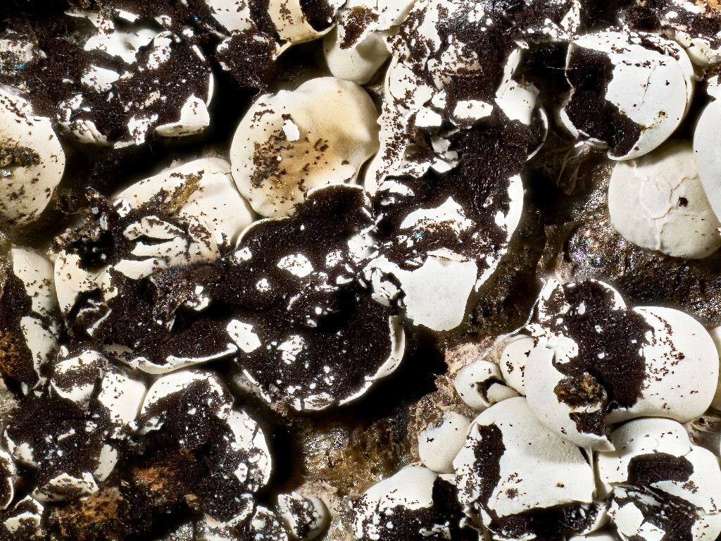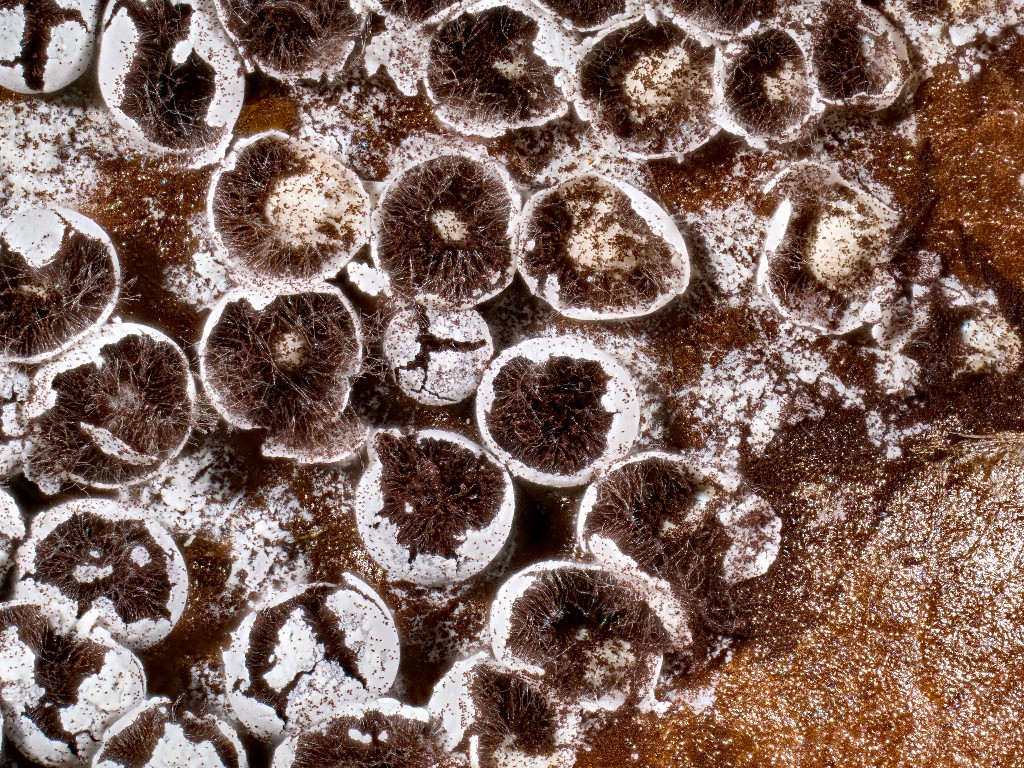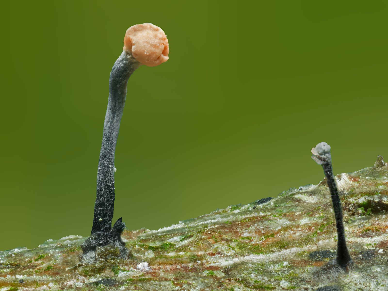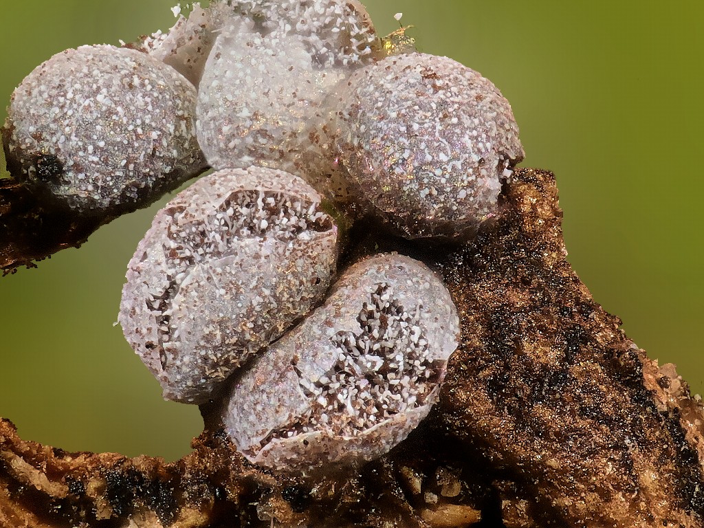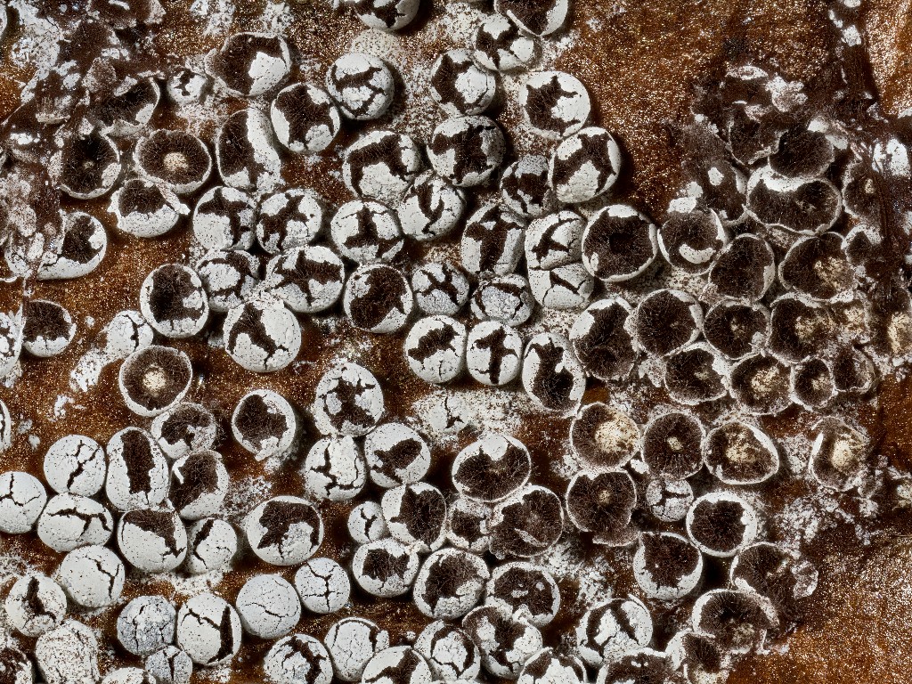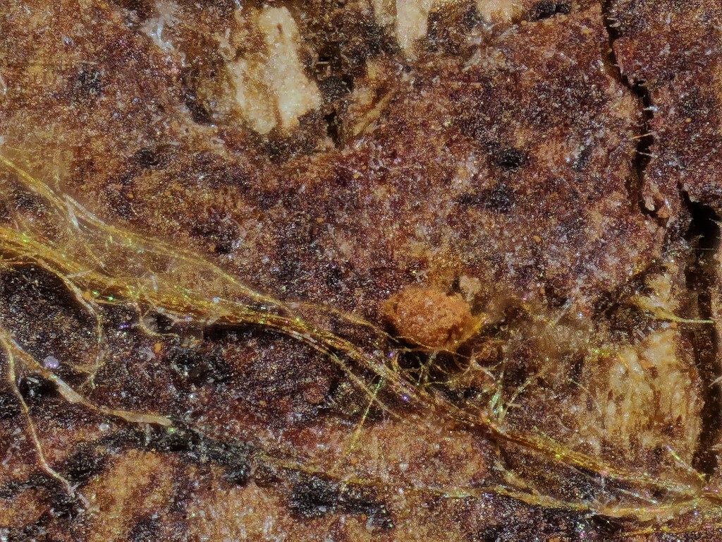 3 Fruchtkörper 3-4 mm im Durchmesser, kurzstielig, Asci 140,4 x 13,6, IKI+, Haken-, Sporen im Mittel 34,63 x 6,45 (Q=5,45) scutuloid, gekrümmt und mit 1 bis 3 Setulae am Ende. Einige Sporen im Ascus mit einer Septe. Die Bestimmung erfolgt nach Declercq (2004) und Baral & Bemmann Ascomycete.org, 5 (4) : 109-128. Oktobre 2013. Wir haben den Fund als