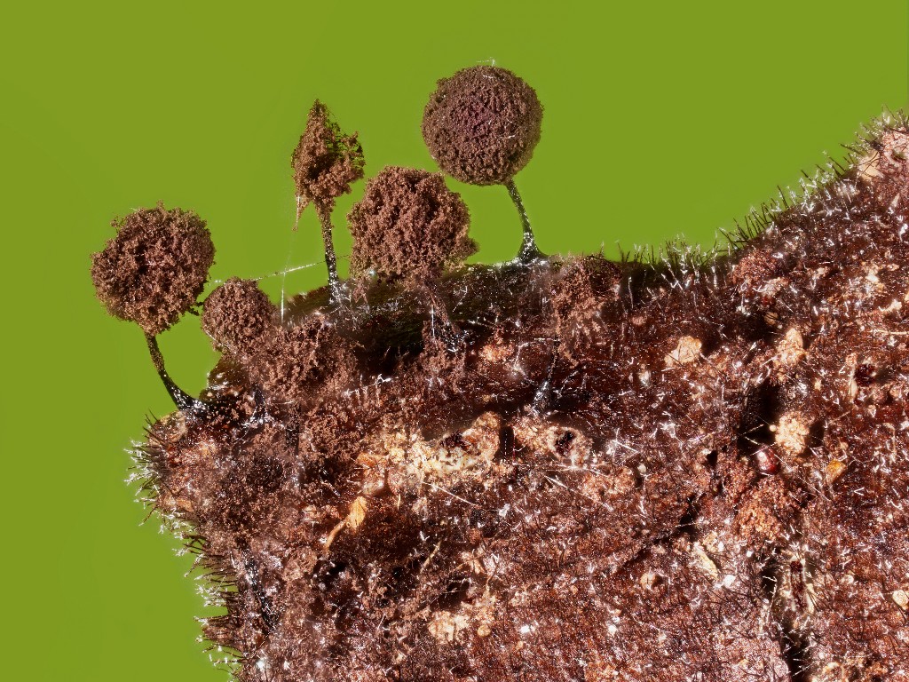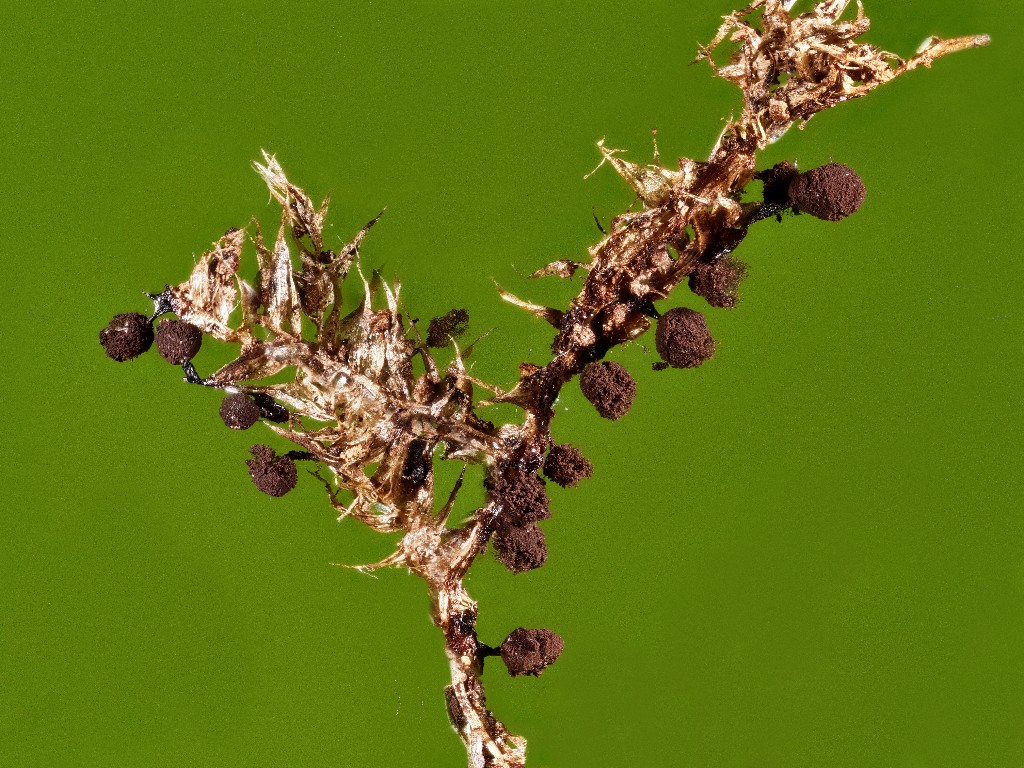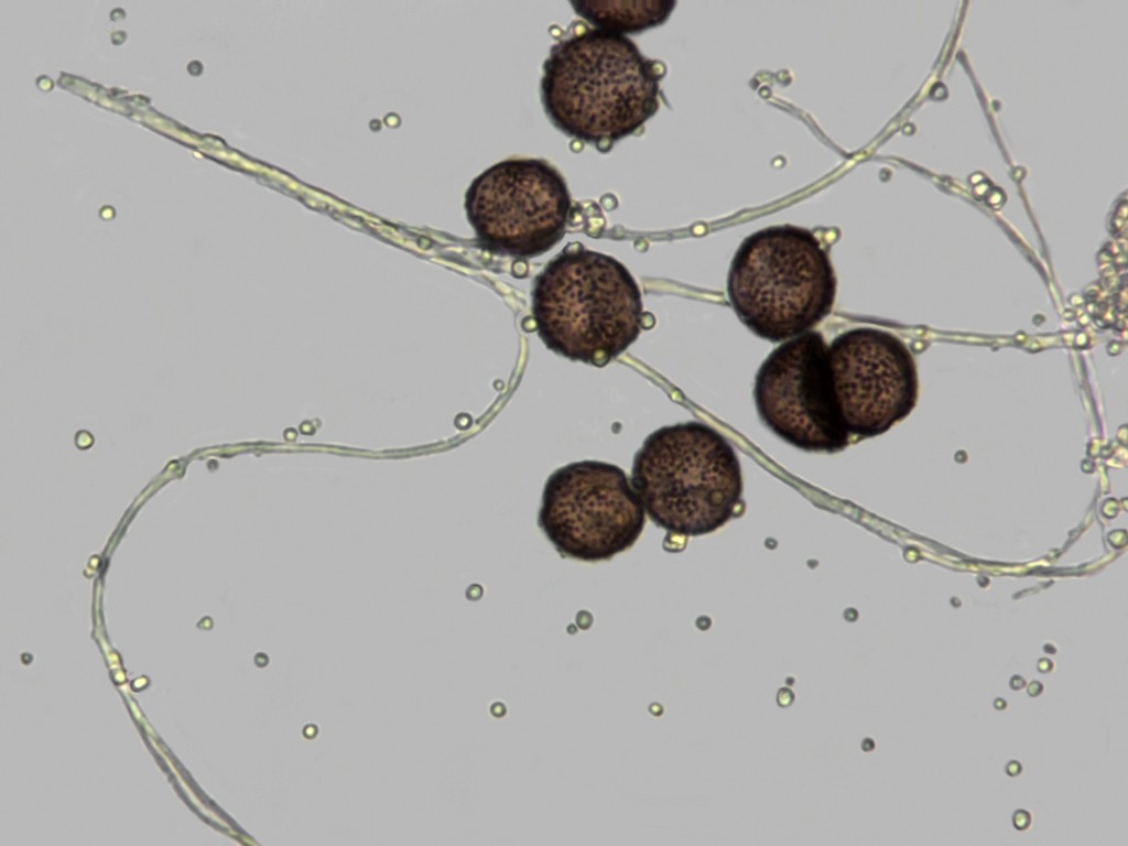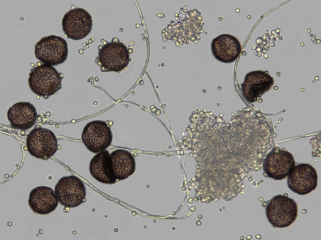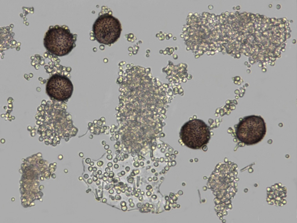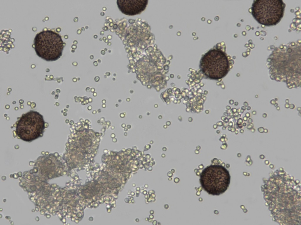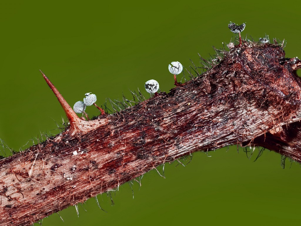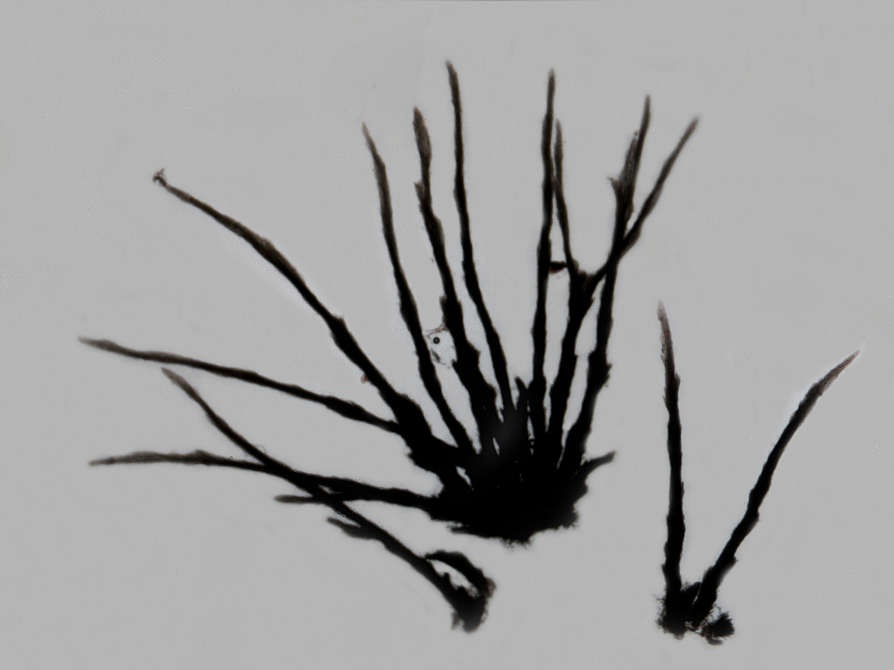 3 Fruchtkörper 3-4 mm im Durchmesser, kurzstielig, Asci 140,4 x 13,6, IKI+, Haken-, Sporen im Mittel 34,63 x 6,45 (Q=5,45) scutuloid, gekrümmt und mit 1 bis 3 Setulae am Ende. Einige Sporen im Ascus mit einer Septe. Die Bestimmung erfolgt nach Declercq (2004) und Baral & Bemmann Ascomycete.org, 5 (4) : 109-128. Oktobre 2013. Wir haben den Fund als