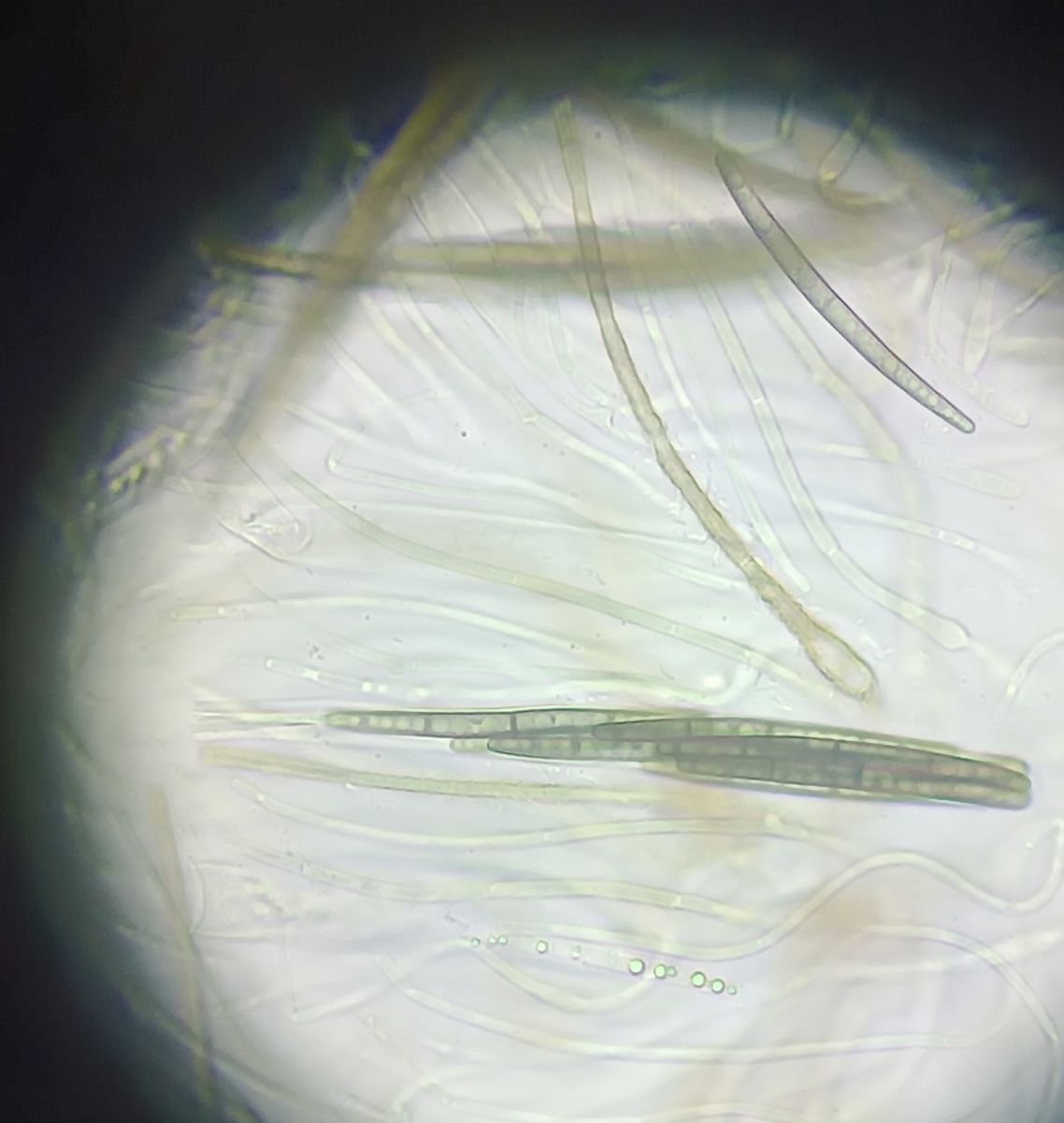 8. Dann wieder ein neues Keulchen. Wieder weiß, aber nicht runzelig. Enno konnte sich falcata vorstellen, ich hatte aber nur kurz die Sporen angeschaut und dann ab ins Herbar. Vermutlich ein Erstfund.