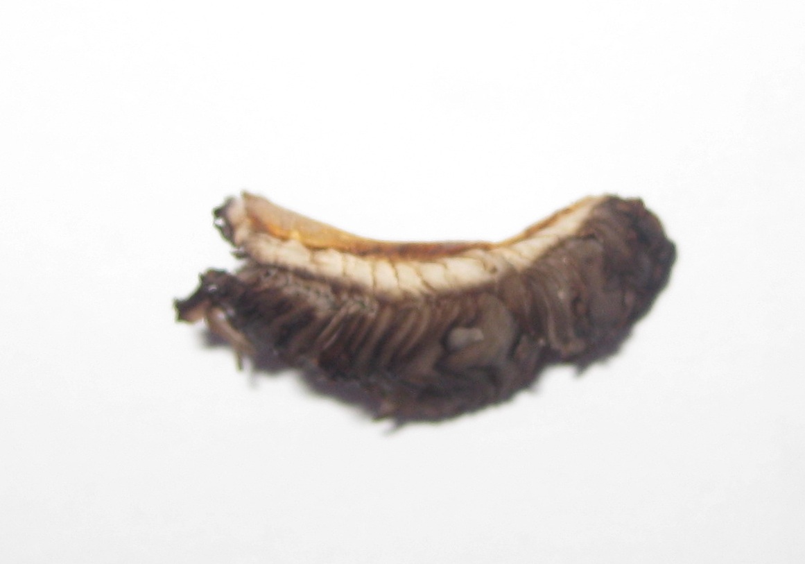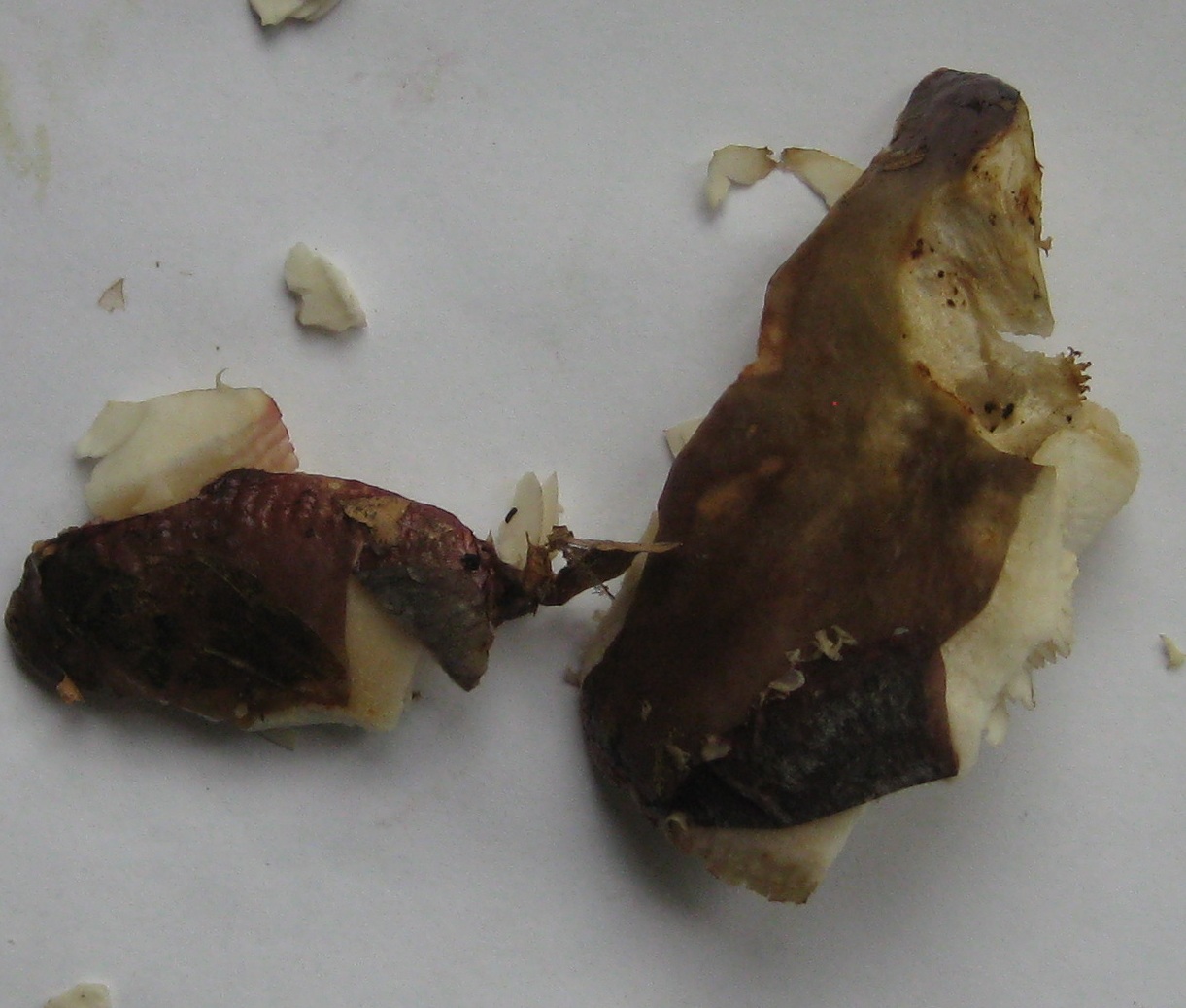 Leider habe ich nur noch eine kleine Seitenansicht eines Stücks eines Pilzes. Die braunen, dichten Lamellen sprechen doch klar gegen einen Knollenblätterpilz, oder nicht? Der Pilz war weiß und hatte einige gelbe Flecken, einen deutlich gelben Fleck in der Hutmitte.