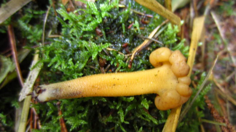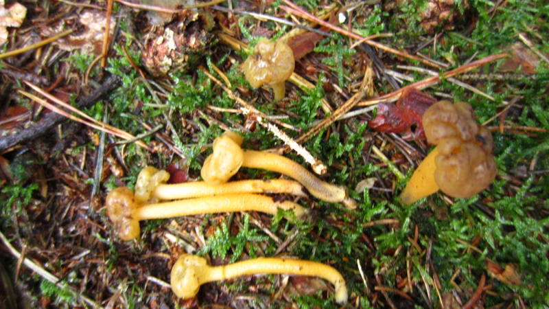 Zwischen den Fichten fand ich diese Gallertkäppchen (Leotia). Sind hier evtl. Grüngelbe Gallertkäppchen (Leotia lubrica)? Leider habe ich keine bessere Fotos von diesen Pilzen. Ein paar Fruchtkörper habe ich allerdings noch im Kühlschrank aufbewahrt. Bei Bedarf kann ich deshalb weitere Fotos nachliefern.