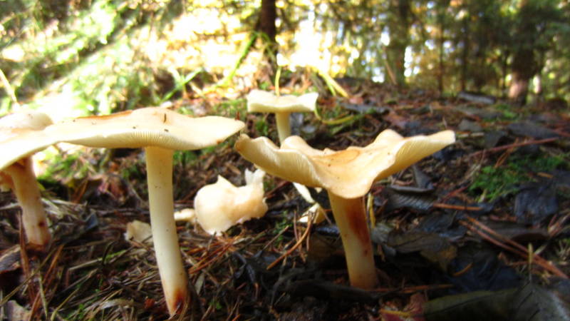 Hier müssten die Gefleckten Rüblinge (Rhodocollybia maculata, syn. Collybia maculata) sein