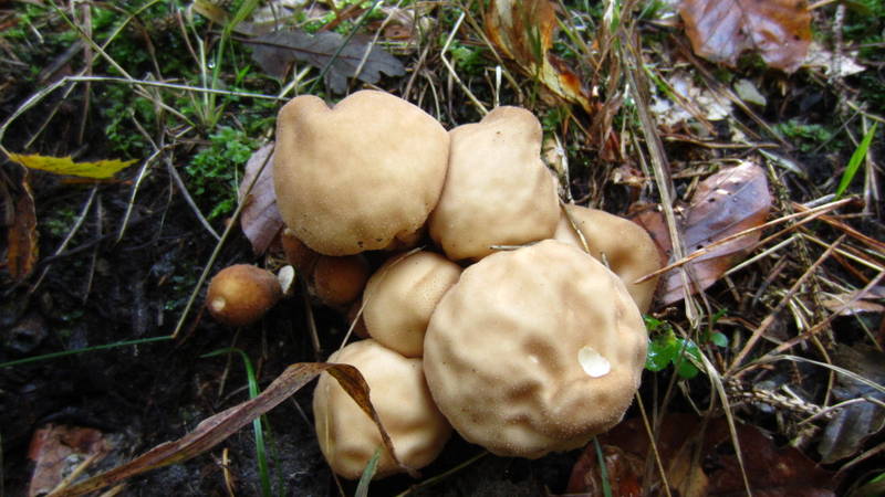 Ein paar runzelige Stäublinge, die ich nicht sicher bestimmen konnte. Vermutlich sind hier ältere Fruchtkörper von Birnen-Stäublingen (Lycoperdon pyriforme):