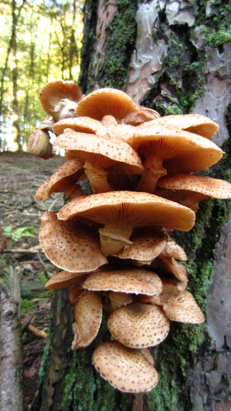 Auf einer Kiefer wuchsen riesen große Hallimasche. Es müsste hier Dunkler Hallimasch (Armillaria solidipes, syn. Armillaria ostoyae) gewesen sein.