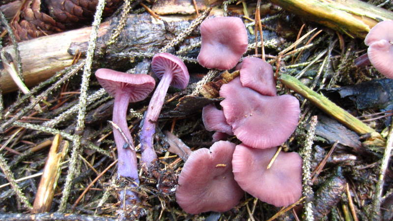 Violette oder Amethystfarbene Lacktrichterlinge (Laccaria amethystina), diesmal im Nadelstreu wachsend: