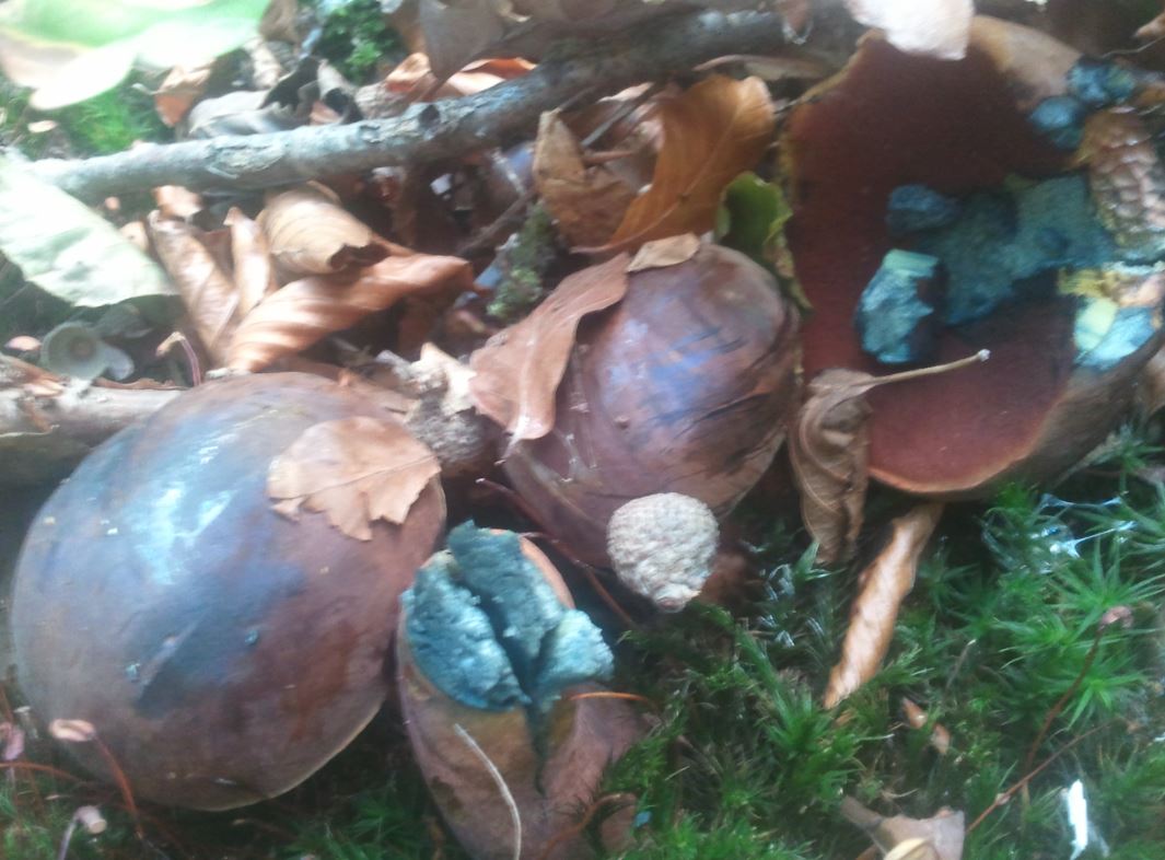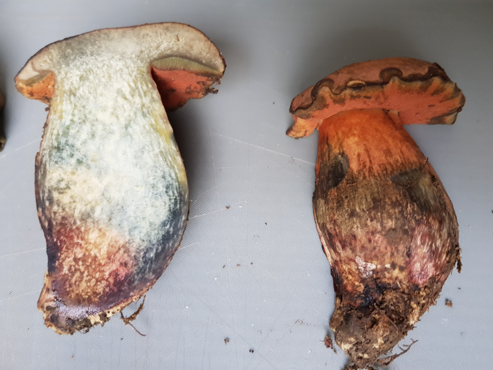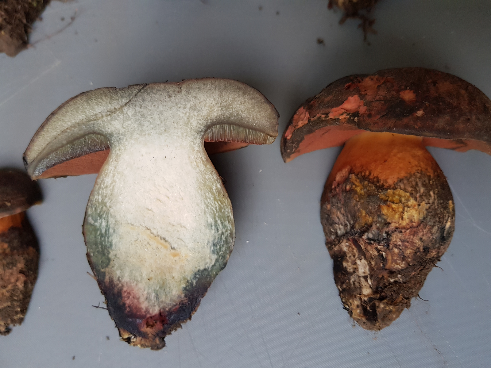 Man sieht hoffentlich auf manchen Bildern, dass der Pilz unten am Stiel fast sofort blau wird, aber im oberen Bereich des Stiels + Hut kaum bis gar keine Verfärbungen auftreten. Wie beschrieben, Röhren werden auf Druck aber blau.