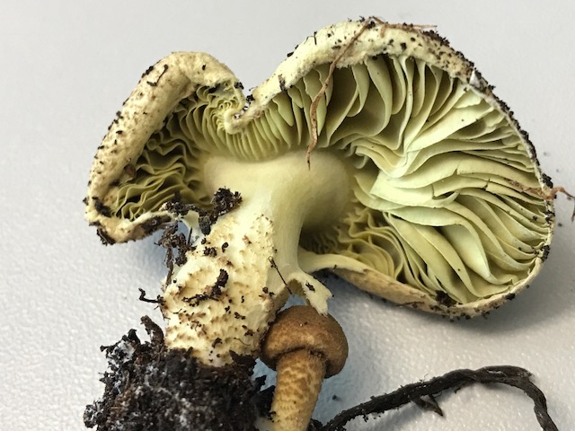Auf meinem Monitor werden die Farben nicht so kräftig wiedergegeben. Die Lamellen sind auf jeden Fall gelbgrün. Der große Fruchtkörper ist ca. 3cm hoch und der Hut an der breitesten Stelle 4cm breit. Der kleine Fruchtkörper ist grad mal 8-9mm groß. Vom Geruch her riecht er pilzig, aber unangenehm. Mein Geruchssinn ist heute leider etwas beeinträchtigt, aber meine Kollegin sagte etwas übertrieben, dass das ganze Büro stinkt.