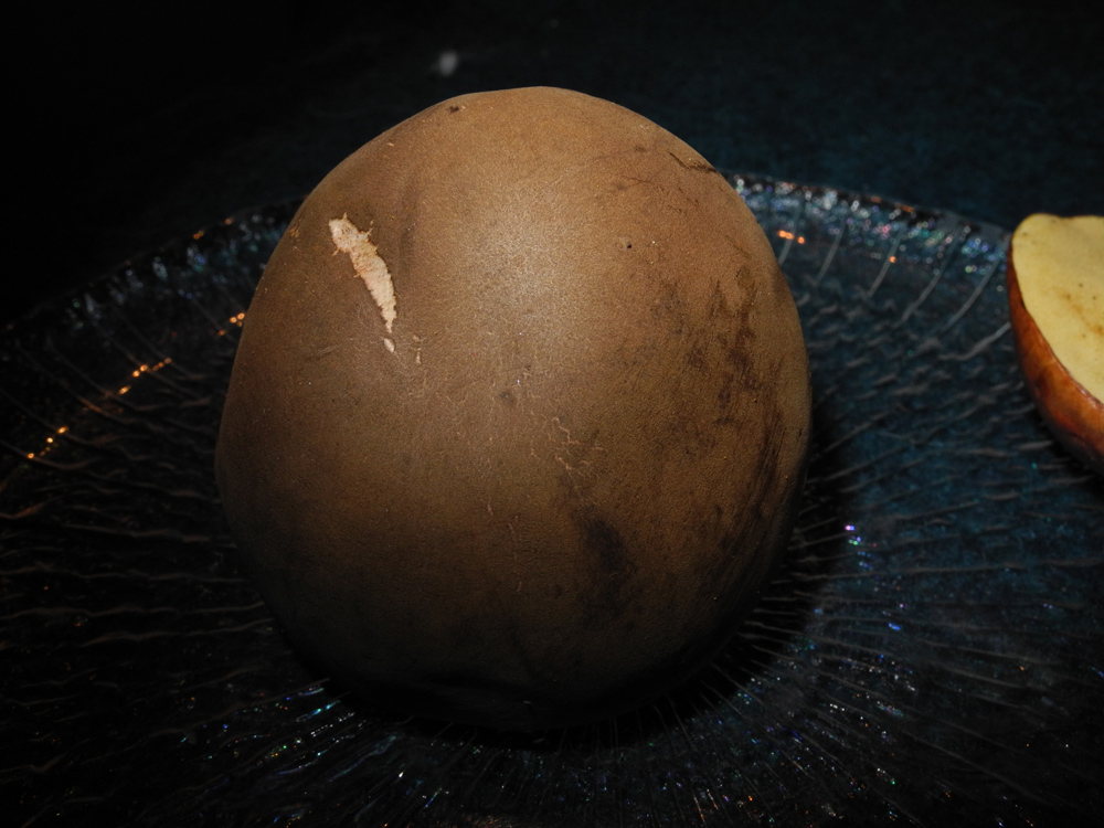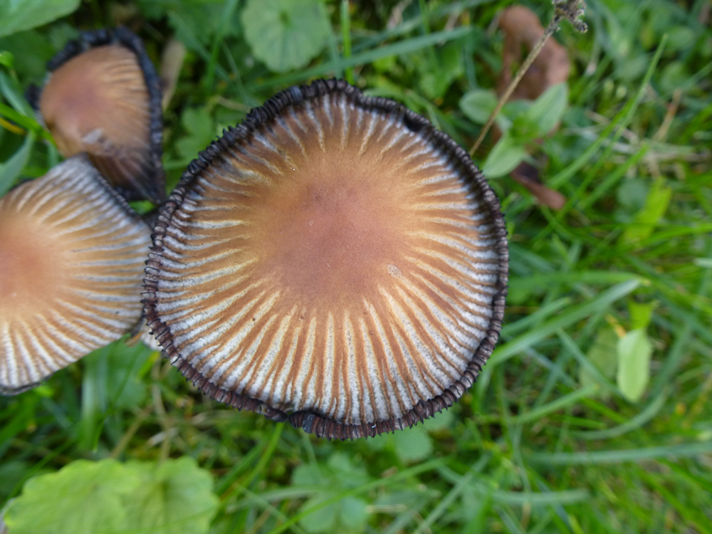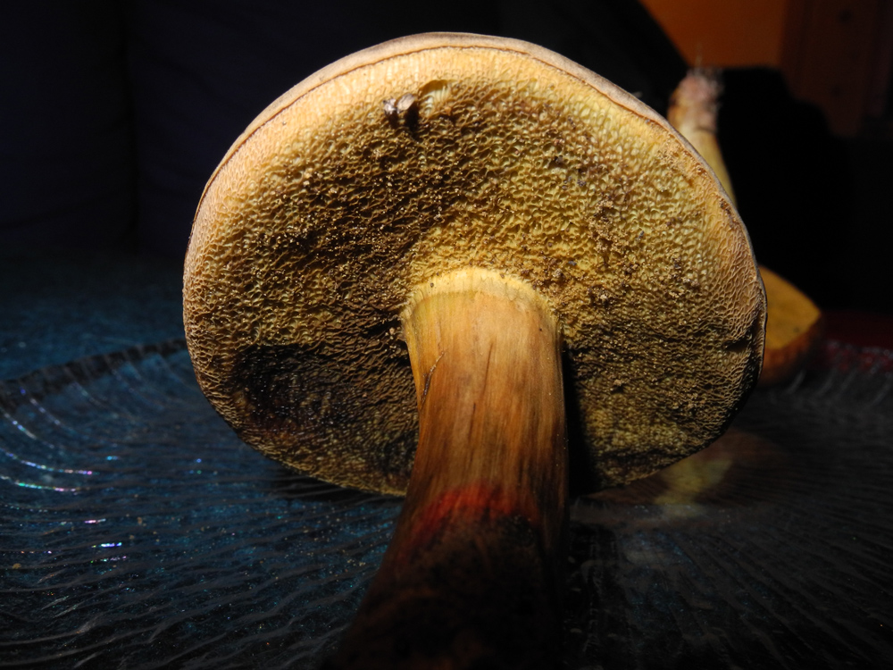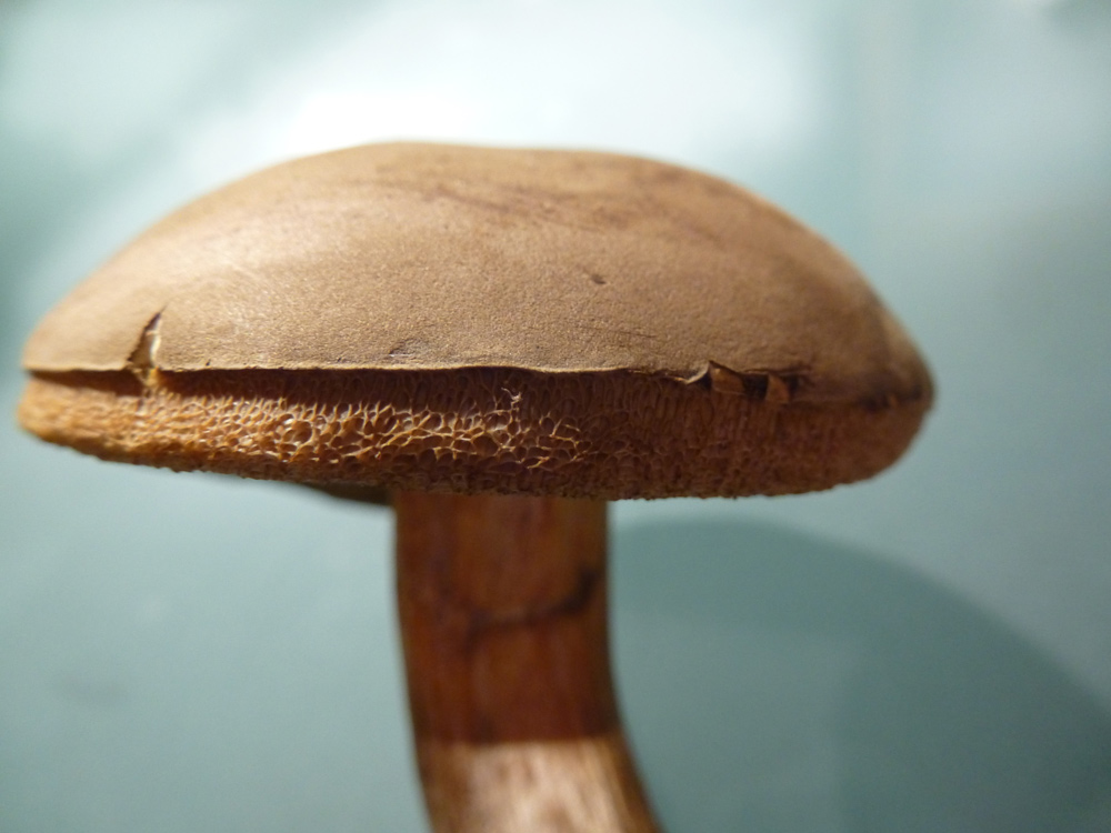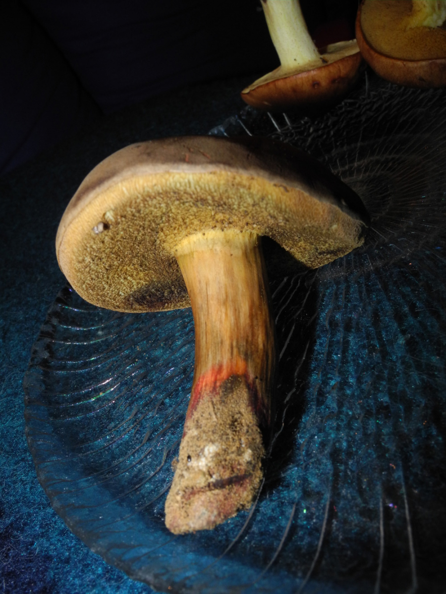 Der Hut des dunkleren Röhrlings war ca. 5 cm im Durchmesser, dunkelbraun und trocken-samtig. Die Röhren waren ebenfalls dunkelbraun. Er war ziemlich fest. Unten am Stiel befand sich ein roter Ring. Die Röhren waren überstehend und haben gebläut, auch beim Durchschneiden hat er relativ stark gebläut. Er wuchs im Mischwald auf eher sandigem Boden.
