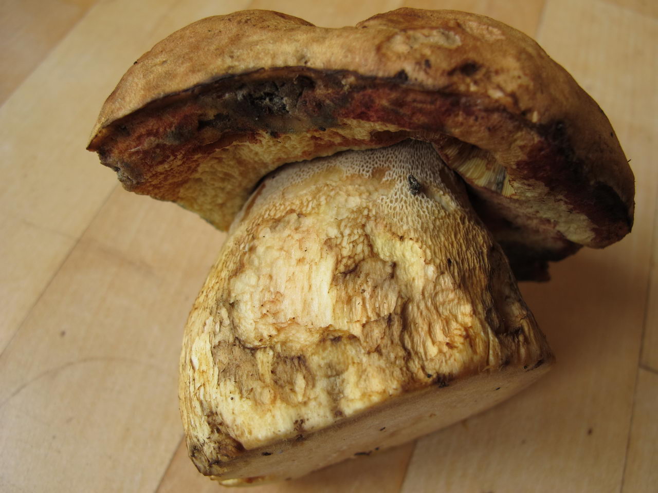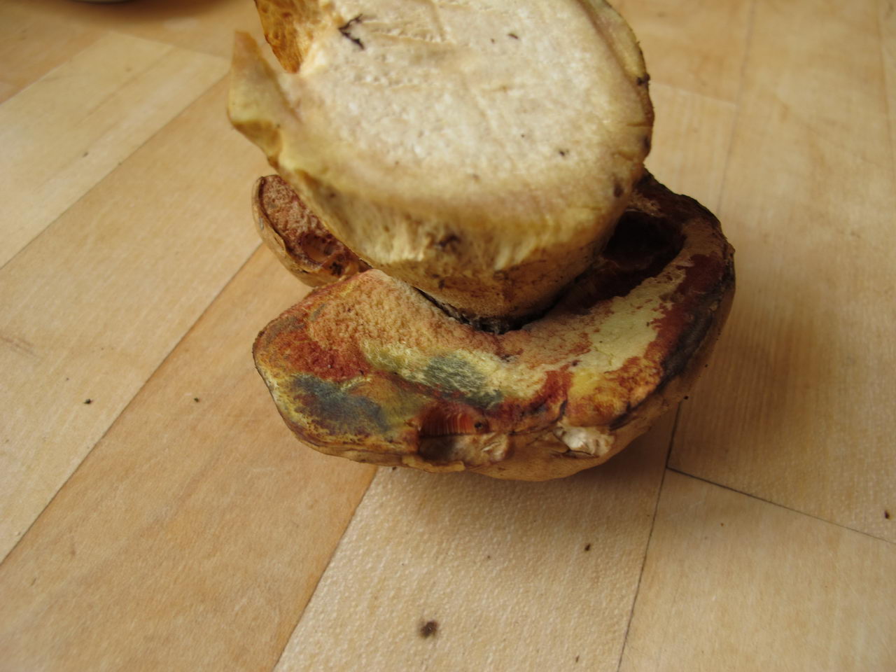 Die Fotos sind am Sammeltag gemacht worden. Optisch hat sich der Pilz in der Zeit nicht verändert. Die Unterseite der Poren war zum Teil gelb und zum Teil rot. Ich dachte der Gelbton wäre eine Veränderung. Auf Bild Nr. 2 kann man an der Fraßstelle sehen, dass die Poren wohl auch innen rot sind (oder das wäre auch eine farbliche Veränderung)