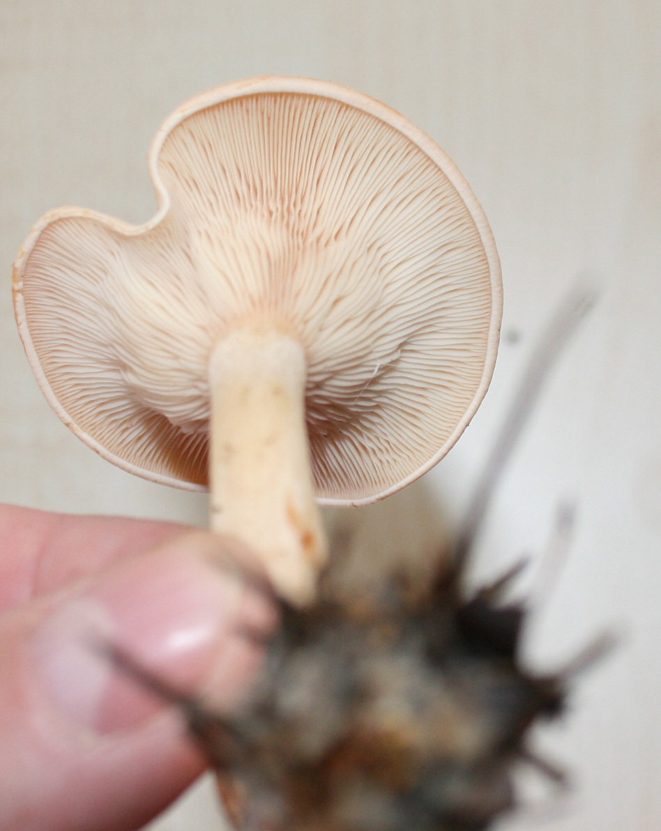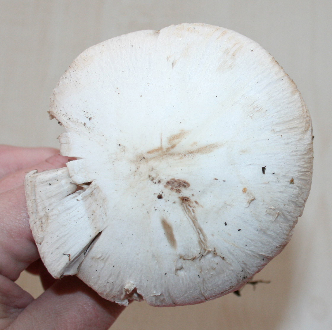 - Beschaffenheit des Hutes (schmierig, trocken, glatt, rau, etc.)- glatt, reinweiss, Lamellen hellbraun