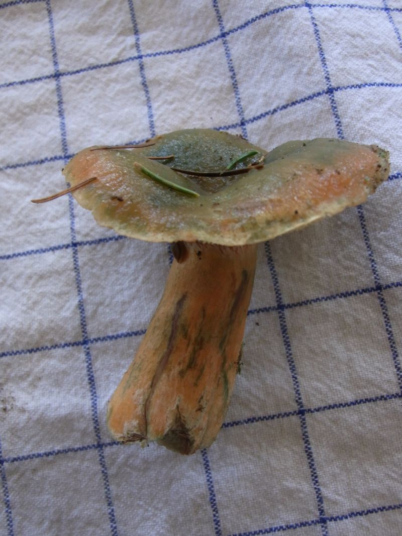 Gefunden habe ich ihnen in einem Hochwald im Moos. Der Pilz war ca. 8cm hoch und hatte einen Hutdurchmesser von 6 cm. Er ist orange gefärbt und im Trichter und auch an den Lamellen hatte er eine grünliche Färbung. Geruch ist leicht aromatisch, Stiel war innen hohl.