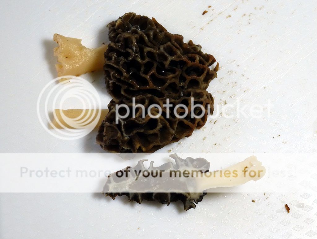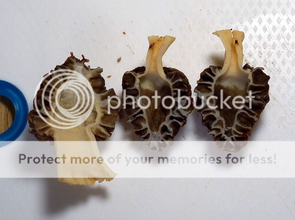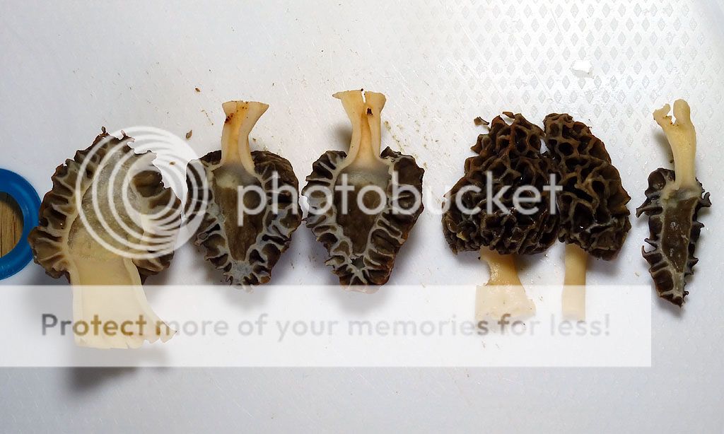 Links zu sehen eine halbierte und für uns "normale" Morchel, daneben die "merkwürdigen" Exemplare.