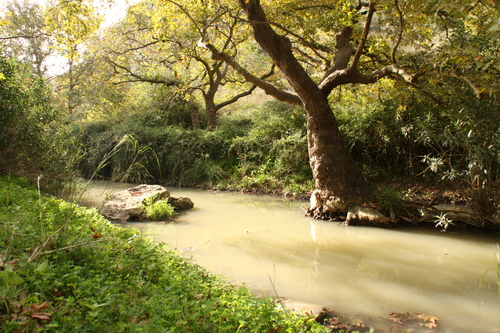 Fluss 1, ca. 2-3m breit, Farbe milchig-braun, unter Platanen: