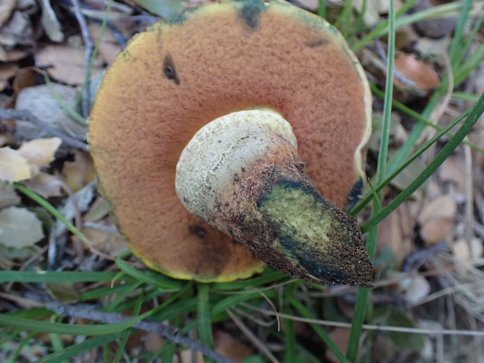 Die Farbe des Fleisches kommt schon hin, denke ich (Monitorverfärbungen können natürlich sein). B. fuscoroseus habe ich öfter schon mit relativ hellem Fleisch gefunden (zwischen "normalen" am gleichen Standort), und der blaut auch auf Druck auf die Röhren, allerdings nicht ganz so schwarzblau, das stimmt.