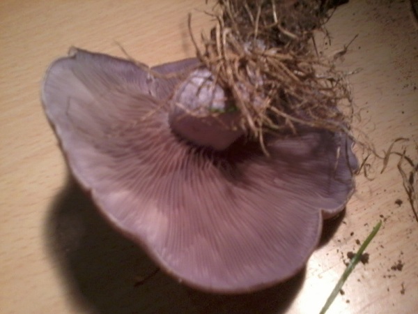 Die Lamellen stehen eng aneinander, sind braun und scheinen ebenfalls von Violett durchzogen zu sein.