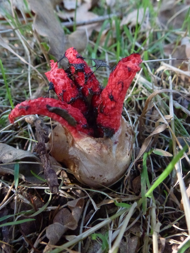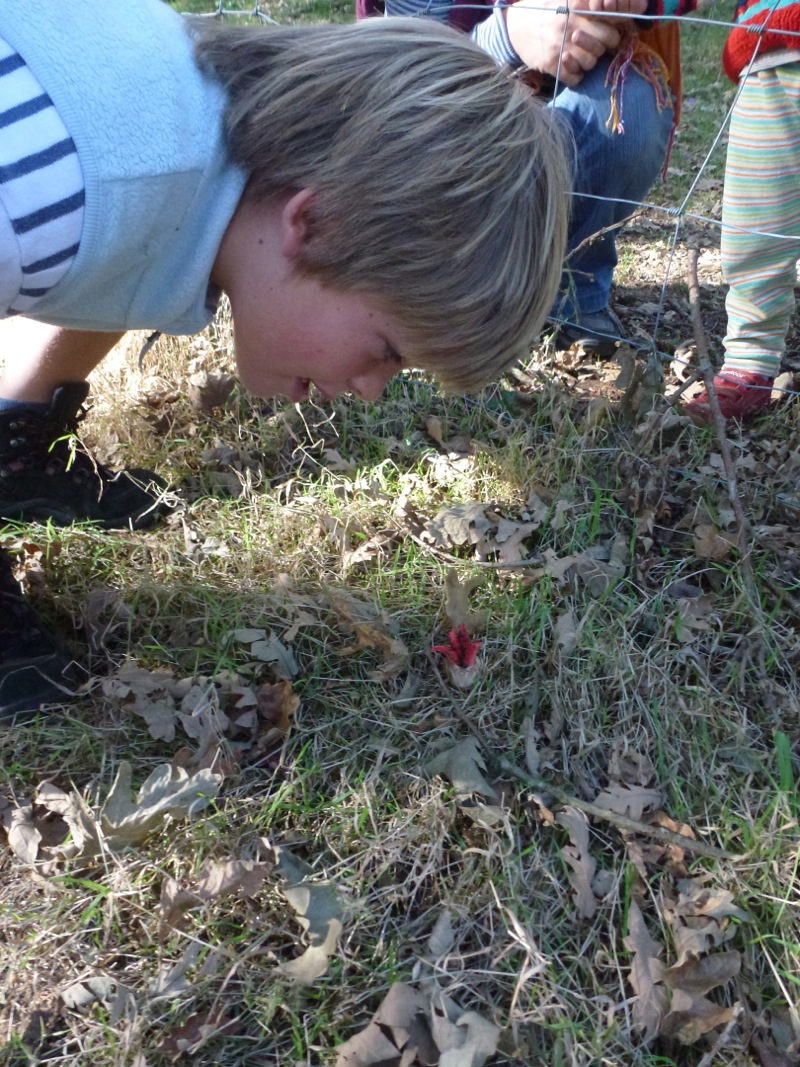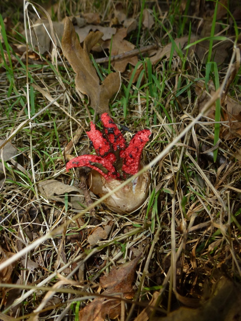 cremeroter Taeubling? ein Porphyrroehrling/ duesterer Roehrling?, riecht eigen. Ein Stachelbart? Hirschgeweihiger Keulenpilz? und eben dieser seltsame Knallrote Pilz der aussieht, als kaeme er von einem anderen Planeten (im letzten Teil):