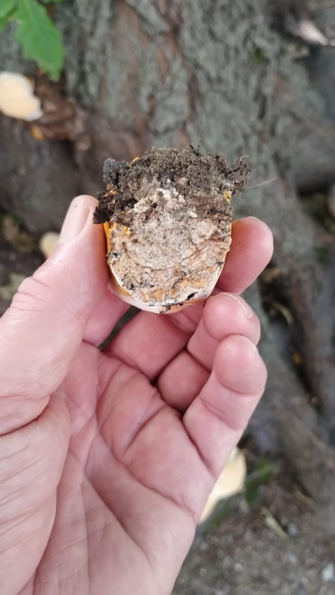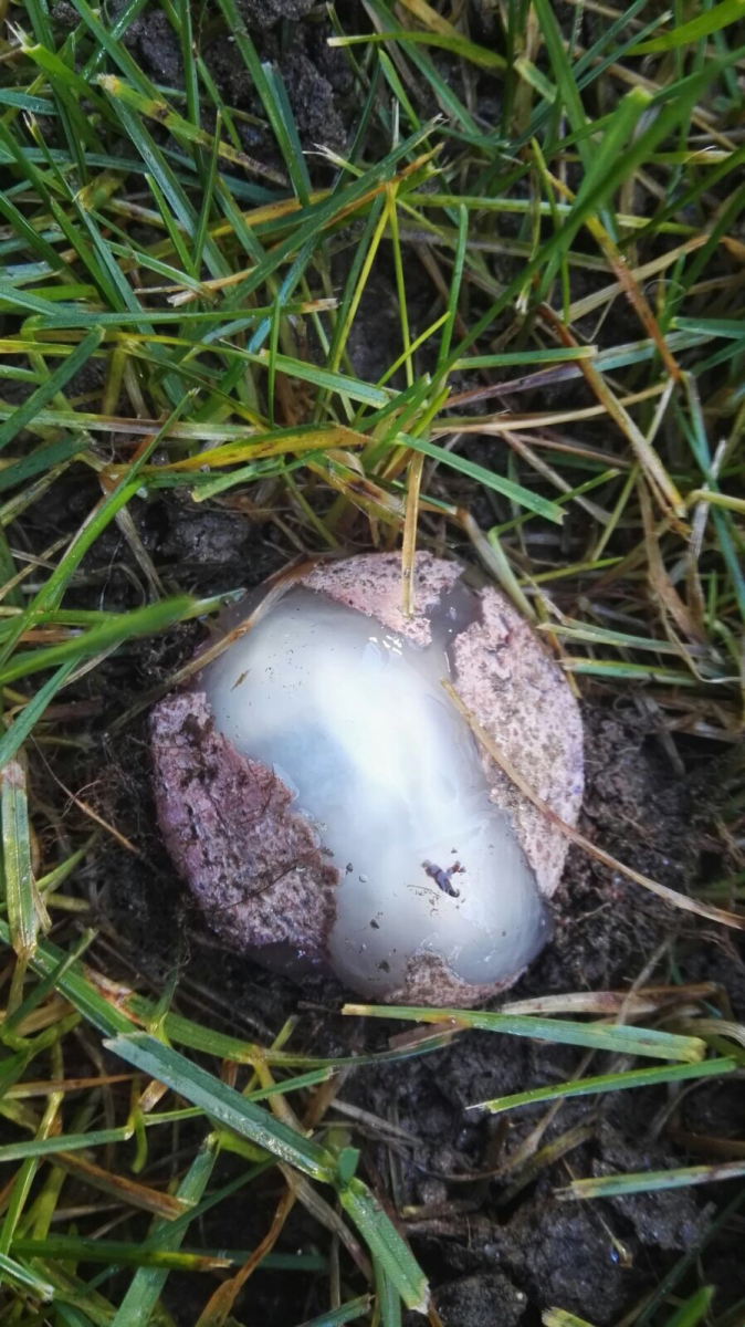 Kann das ein Pilz sein. Das weiße ist gallertartig und die Außenhülle weich.